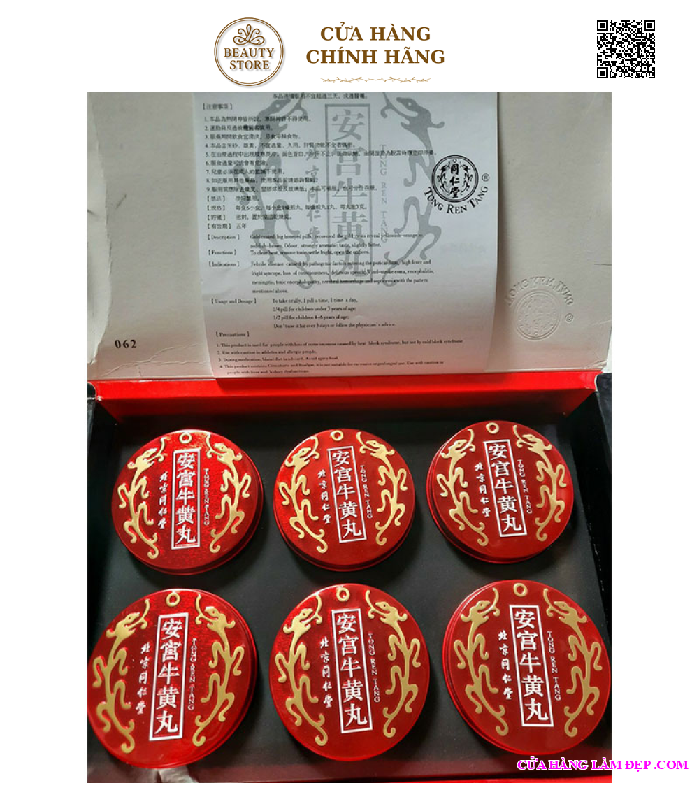 An cung ngưu hoàng hoàn hộp thiếc đỏ Đồng Nhân Đường – Angong Niuhuang Wan (thương hiệu Trung Quốc) là sản phẩm áp dụng công thức cổ truyền, lưu hành lâu đời và được tinh chế thông qua các kiểm nghiệm lâm sàng khác nhau. Đặc biệt được kết hợp giữa hàm lượng truyền thống và phương thức công nghệ hiện đại, đảm bảo độ chính xác hàm lượng, sự phối trộn và an toàn vệ sinh thực phẩm. An cung ngưu hoàng hoàn Trung Quốc được áp dụng rộng rãi để hỗ trợ khắc phục các thể bệnh như hôn mê, mê sảng, viêm não, sốt cao co giật, cảm nhập tâm bào, huyết áp cao, các vấn đề về đột quỵ não.