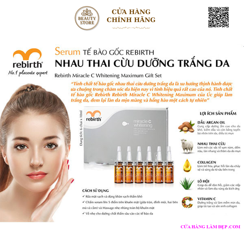 Các nhà khoa học cho biết là Serum Tinh Chất Tế Bào Rebirth Nhau Thai Cừu Dưỡng Trắng Da có thể giúp da mịn màng, tươi trẻ, tăng cường và điều chỉnh độ ẩm giúp da mịn màng, luôn trắng hồng.