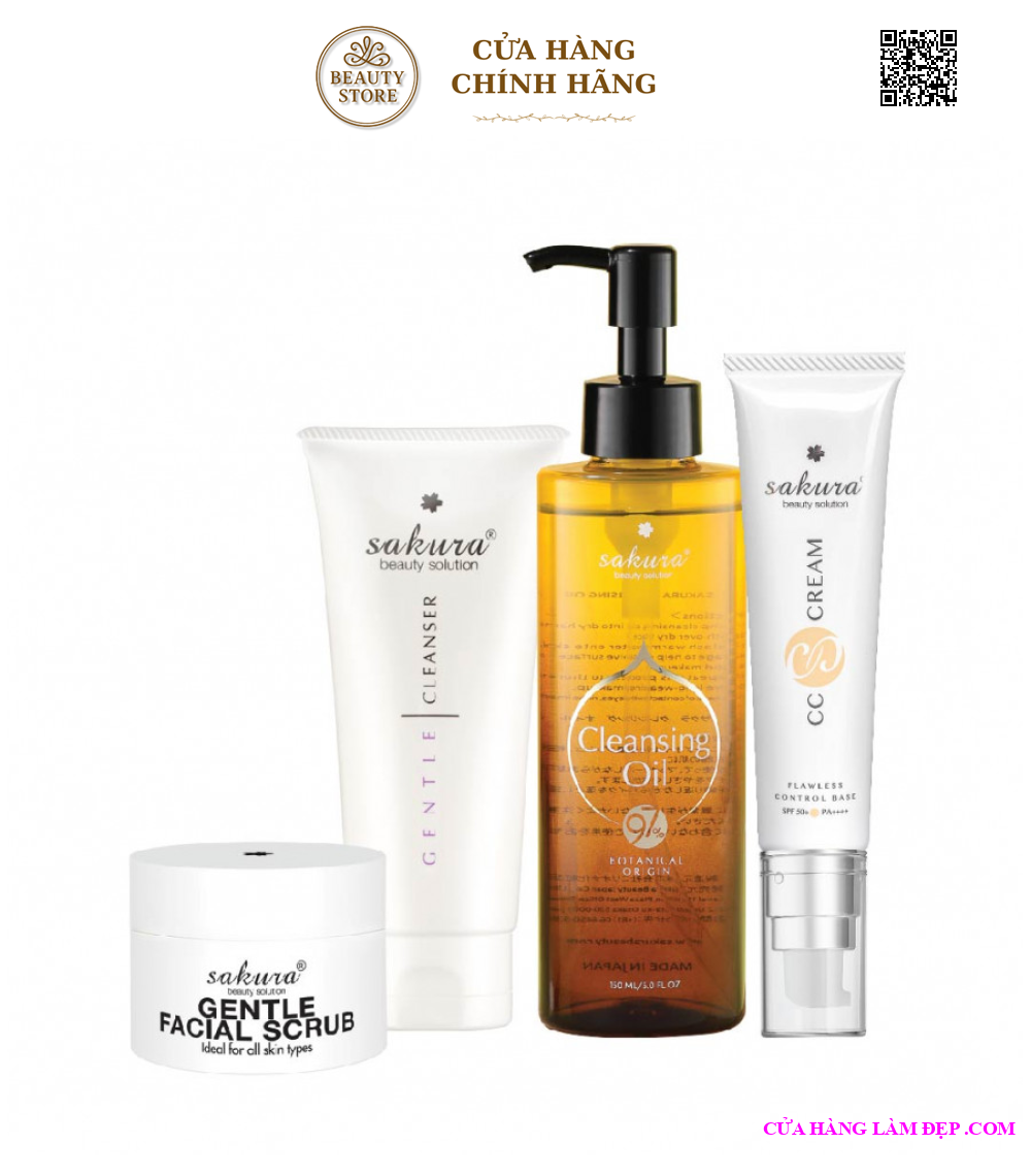 Bộ 4 sản phẩm: Sữa rửa mặt Sakura Gentle Cleanser (100ml), Kem Tẩy Tế Bào Chết Sakura Gentle Facial Scrub (30ml), Kem Trang Điểm Chống Nắng Sakura CC Cream (40ml), Dầu tẩy trang Sakura Cleansing Oil (150ml).