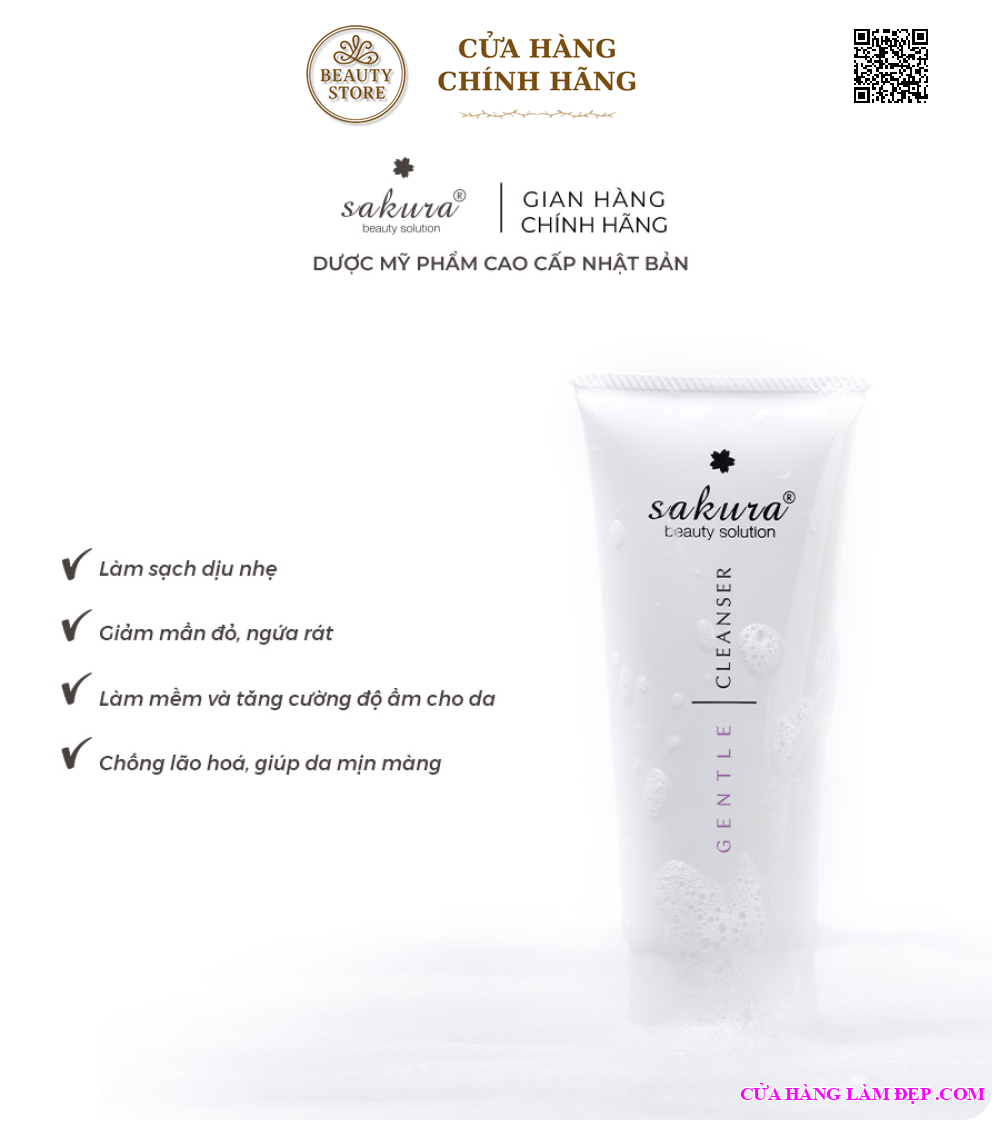 - Sữa rửa mặt Sakura Gentle Cleanser giúp tẩy bỏ lớp trang điểm nhẹ nhàng và làm sạch hoàn toàn bụi bẩn. Sữa rửa mặt thiết kế dành cho da nhạy cảm, được cấu tạo từ các thành phần thiên nhiên vô cùng lành tính và an toàn cho da.