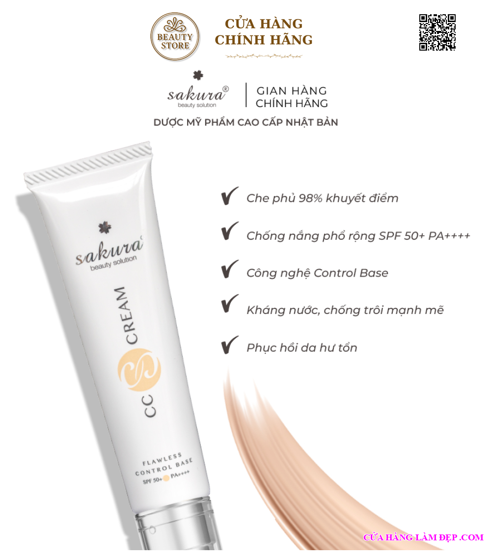 - Kem Trang Điểm Chống Nắng Sakura CC Cream Flawless Control Base SPF50 với 3 tính năng nổi bật trong cùng 1 sản phẩm giúp tạo lớp nền mỏng mịn, bảo vệ làn da, đồng thời, che phủ được 98% khuyết điểm. Thành phần của kem trang điểm Sakura chủ yếu được chiết xuất thảo dược quý hiếm như dầu hạt Nho Đen, tinh chất lá Anh Đào, chiết xuất Cam Thảo, Nho Bạc, Tảo Biển giúp tăng cường dưỡng ẩm và làm sáng da.