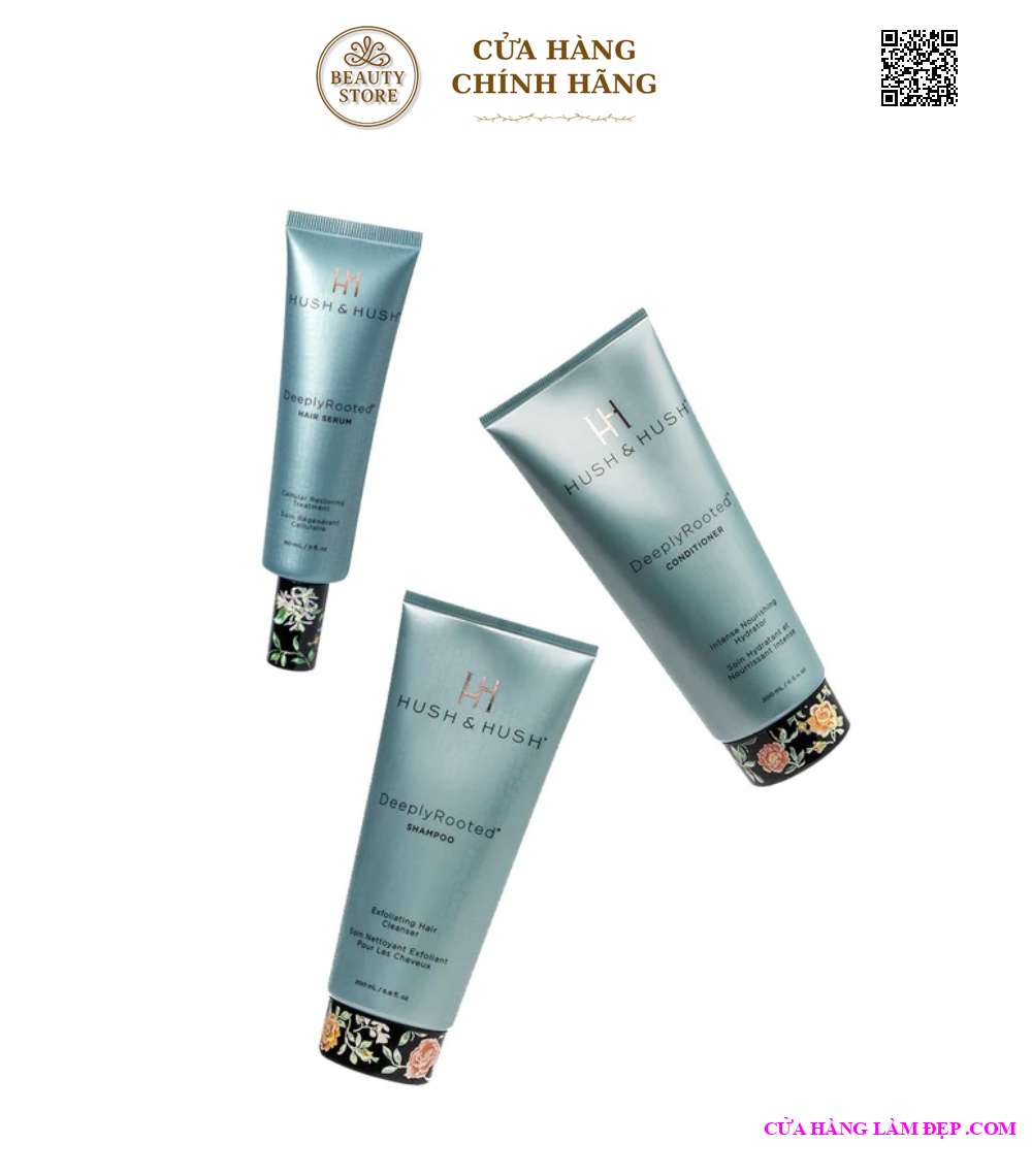 DeeplyRooted Trio bao gồm DeeplyRooted Shampoo (Dầu gội làm sạch, tẩy tế bào chết da đầu), DeeplyRooted Conditioner (Dầu xả siêu cấp ẩm, dưỡng ẩm chuyên sâu) và DeeplyRooted Hair Serum (Tinh chất ngăn ngừa rụng tóc, kích thích mọc tóc) đến từ thương hiệu Hush & Hush.