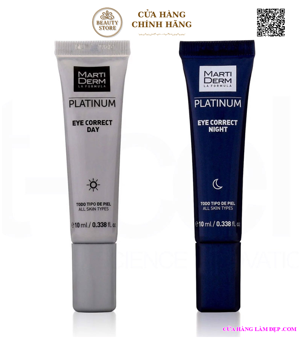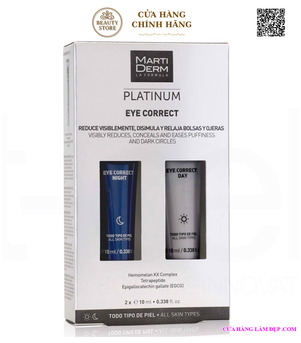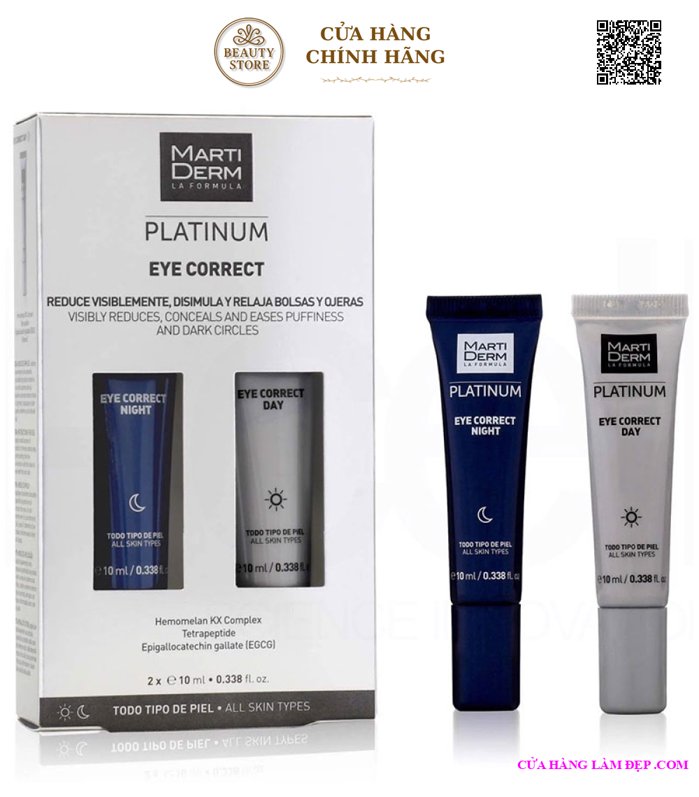 - MartiDerm Platinum Eye Correct là bộ kem dưỡng da vùng mắt gồm 2 tuýp riêng biệt, dùng vào buổi sáng và buổi tối, phù hợp để sử dụng hằng ngày cho da mắt đang gặp các vấn đề về quầng thâm và bọng mỡ dưới mắt. Công thức chứa phức hợp độc quyền Hemomelan KX (Vitamin K oxit và Tranexanic Acid) và EGCG (Epigallocatechin Gallate), đi kèm một số thành phần khác nhau ở mỗi sản phẩm. Kết cấu dịu nhẹ cho vùng da nhạy cảm và cực kì mỏng manh dưới mắt. Sản phẩm giúp vừa chăm sóc vừa giúp che khuyết điểm mà không cần phải sử dụng đến các loại kem trang điểm dày bí khó chịu.