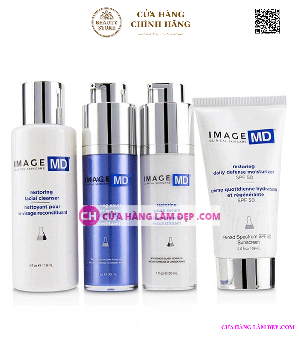 Bộ kit gồm 4 sản phẩm: Sữa rửa mặt Image MD Restoring Facial Cleanser (118ml), Serum Image MD Restoring Youth Serum (30ml), Kem dưỡng Image MD Restoring Youth Repair Crème (30ml), Kem chống nắng Image MD Restoring Daily Defense Moisturizer SPF 50+ (50ml).