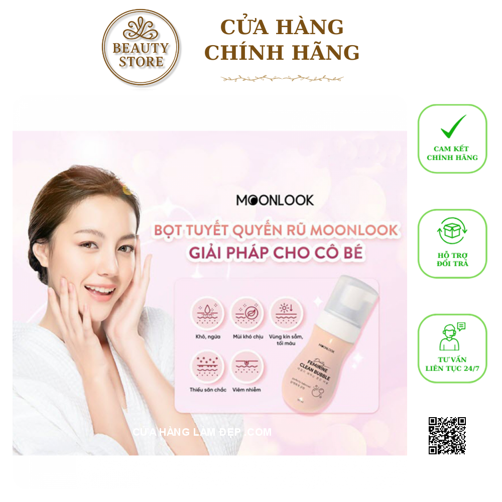 - Bọt tuyết quyến rũ MoonLook là dung dịch vệ sinh đặc biệt dạng bọt tuyết, nhập khẩu 100% từ Hàn Quốc, có tác dụng làm sạch “cô bé” một cách nhẹ nhàng, ngăn ngừa vi khuẩn, cân bằng môi trường pH, hỗ trợ điều trị viêm nhiễm và khử mùi hôi hiệu quả.