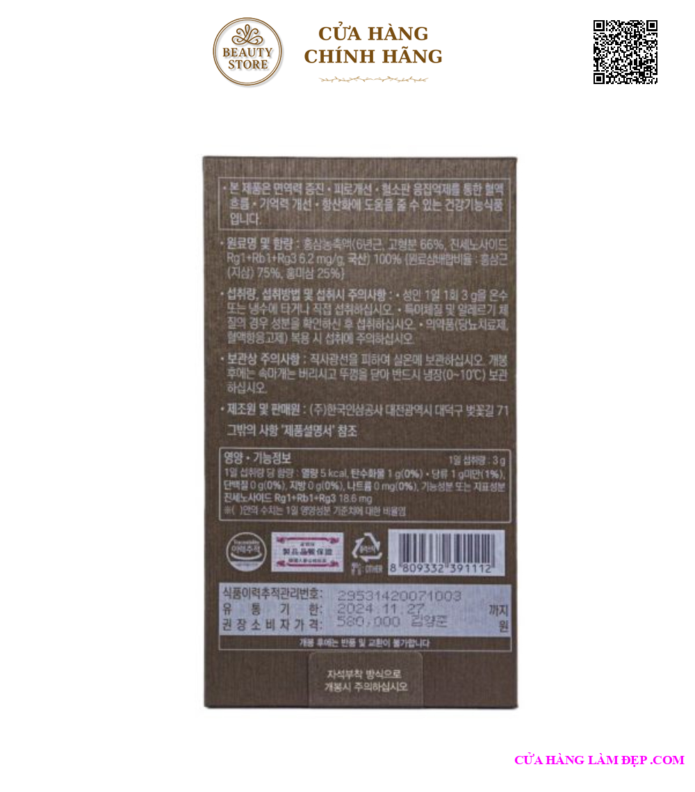 Hồng sâm cô đặc (6 tuổi, hàm lượng chất rắn 66%, ginsenoside Rg1+Rb1+Rg3 6,2 mg/g, sản xuất Hàn Quốc) 100% (tỷ lệ pha trộn nhân sâm thô: rễ nhân sâm đỏ (nhân sâm đất) 75%, nhân sâm đỏ 25%).