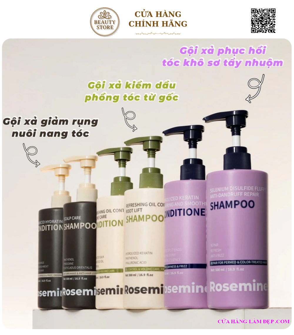 Cặp dầu gội xả Rosemine là dòng chăm sóc tóc chuyên sâu giúp phục hồi tóc hư tổn – giảm gãy rụng – dưỡng tóc suôn mượt và chắc khỏe. Sản phẩm phù hợp cho nhiều tình trạng tóc như tóc khô xơ, tóc dầu, tóc gãy rụng, với các phiên bản chuyên biệt theo từng nhu cầu.