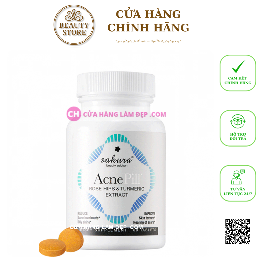 - Viên uống giảm mụn Sakura AcnePill: giúp bảo vệ da khỏi tác động từ các tia UV và cung cấp độ ẩm từ bên trong, tăng cường đề kháng cũng như sản sinh các Collagen mới cho da. Ngoài ra, trong sản phẩm viên uống AcnePill còn có các thành phần được chiết xuất từ tự nhiên như: Rose Hips extract và Curcumin extract. Các tinh chất này giúp làm trẻ hóa làn da và đẩy nhanh quá trình tái tạo mới cho da.