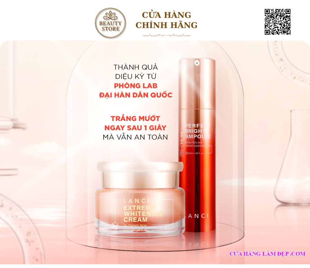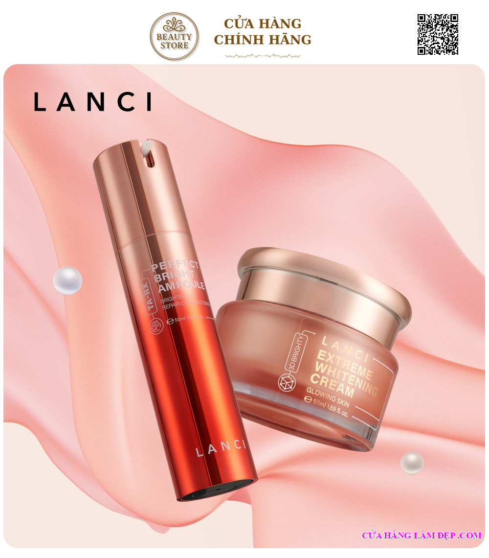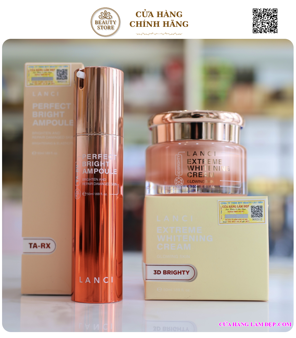 Bộ sản phẩm gồm 1 Serum Duỡng Trắng Lanci Perfect Bright Ampoule TA-RX (50ml) và 1 Kem Dưỡng Trắng Lanci Extreme Whitening Cream 3D Brighty (50ml)