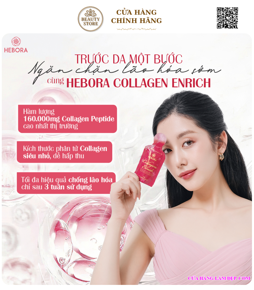 -Nước Uống Hebora Collagen Enrich Nhật Bản tích hợp Collagen cá biển tinh khiết với các thành phần dưỡng da đỉnh cao từ Nhật Bản, Hebora Collagen kiến tạo làn da “pha lê” trắng hồng, căng mọng trong veo, đồng thời triệt tiêu các dấu hiệu lão hóa nhăn chùng, sạm nám. Giúp bạn sở hữu vẻ đẹp tươi trẻ bền vững và đầy sức sống.