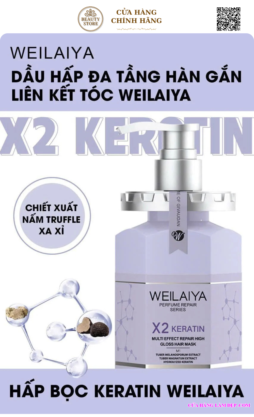 Hấp Đa Tầng Weilaiya X2 Keratin siêu phục hồi sâu tận lõi tóc nhờ chiết xuất nấm Truffle, các hoạt chất peptide. Siêu nhẹ, tơi phồng và không bết dính tóc