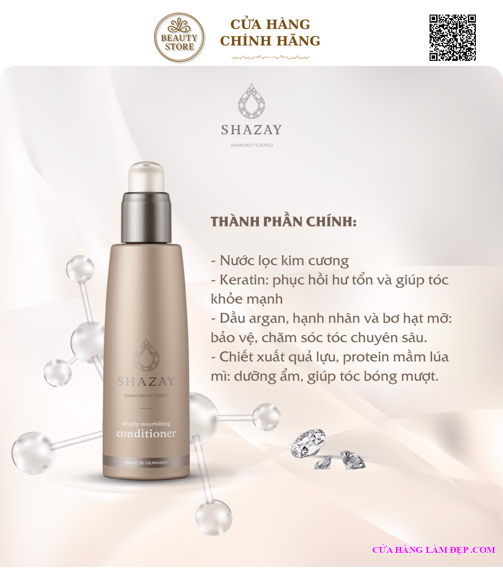 - Giàu dưỡng chất, tăng cường độ ẩm cho tóc: Dầu xả Shazay chăm sóc tóc chuyên sâu Deeply Nourishing là sự kết hợp giữa nước lọc kim cương cùng đa thành phần dưỡng chất mang đến liệu pháp dưỡng ẩm đặc biệt và chuyên sâu, giúp giảm xoăn cứng, tóc trở nên mềm mượt, dễ chải, bóng mịn tự nhiên.