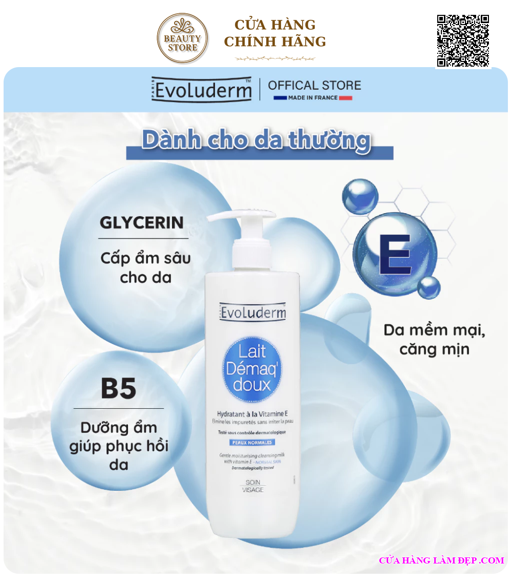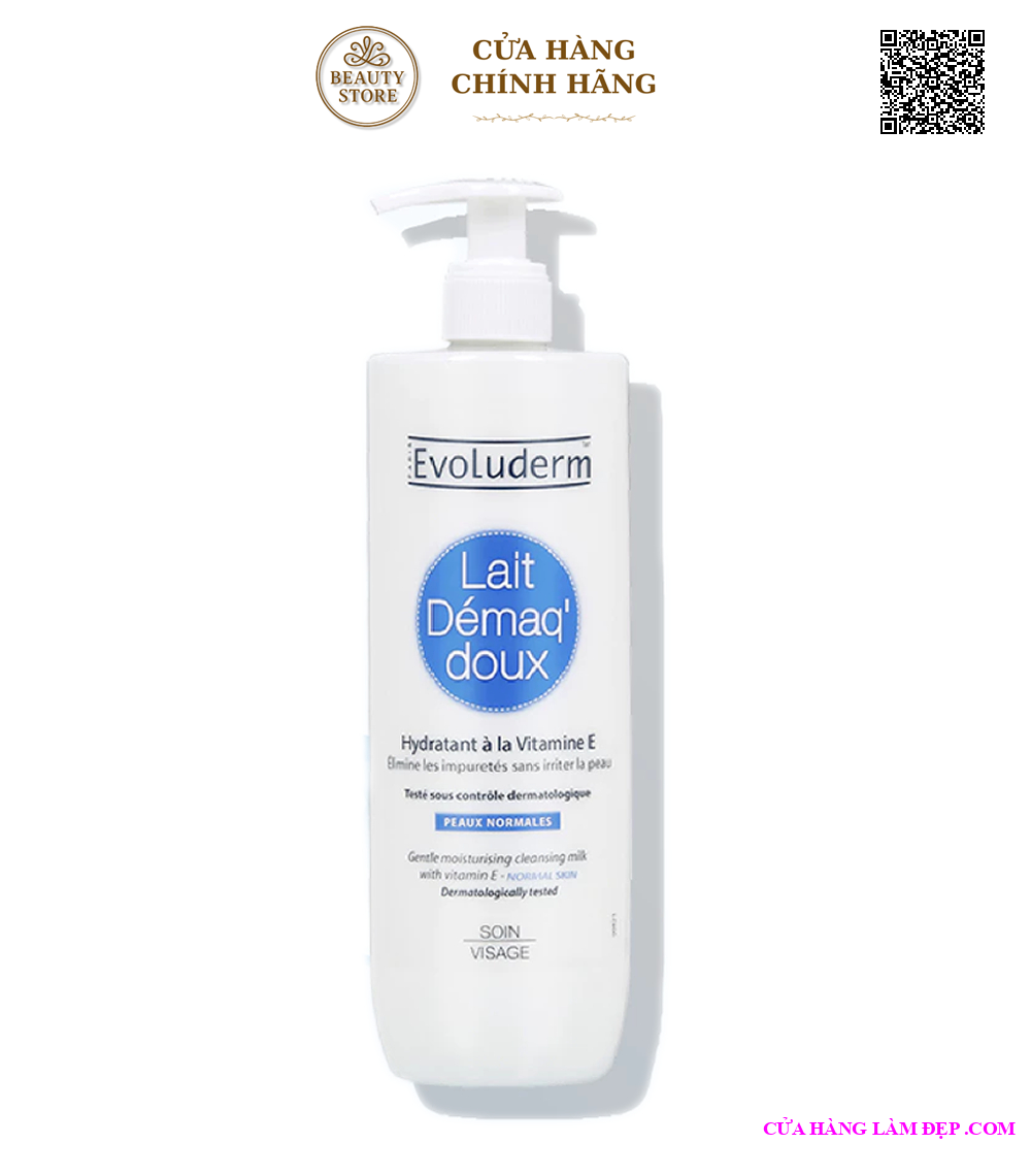 Tại hệ thống Cửa Hàng Làm Đẹp, sản phẩm Evoluderm Lait Demaq Doux Sữa Tẩy Trang Và Rửa Mặt Bổ Sung Vitamin E Dưỡng Ẩm Cho Làn Da Mịn Màng Tươi Mát Từ Pháp 500ml có giá 325.000 VNĐ