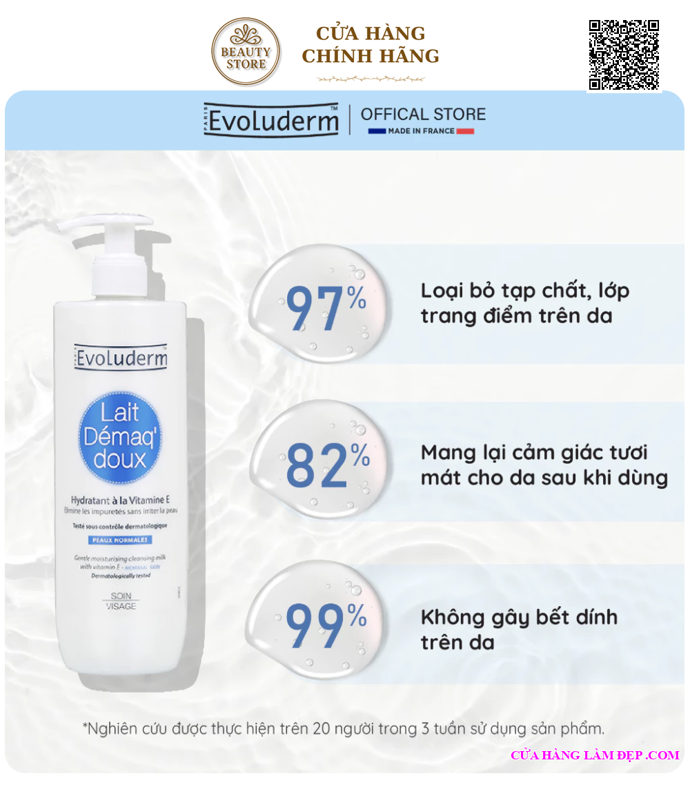 Evoluderm Lait Demaq Doux Sữa Tẩy Trang Và Rửa Mặt Bổ Sung Vitamin E Dưỡng Ẩm Cho Làn Da Mịn Màng Tươi Mát Từ Pháp 500ml được khách hàng của Hệ Thống Cửa Hàng Làm Đẹp đánh giá cao.