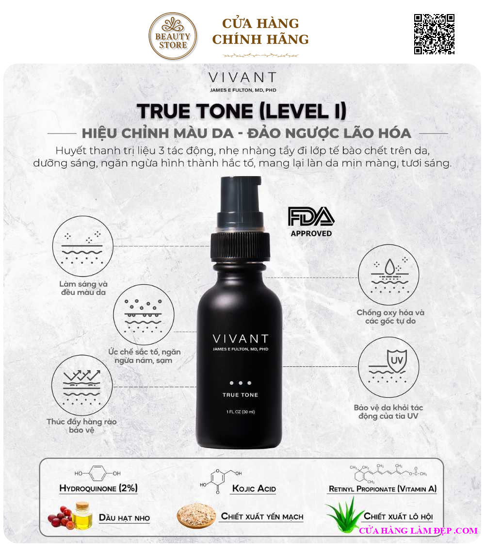 True tone – Đảo ngược các dấu hiệu lão hóa và tác hại của môi trường trong một công thức trị liệu ba tác động, tẩy tế bào chết nhẹ nhàng, loại bỏ sắc tố melanin và giúp làn da mịn màng, đều màu.