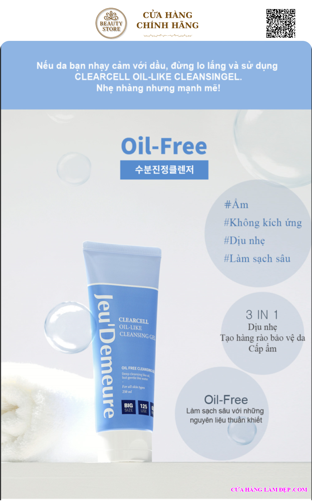 Jeu'Demeure Clearcell Oil-like Cleansing Gel là sản phẩm làm sạch da cao cấp đến từ thương hiệu mỹ phẩm Hàn Quốc Jeu'Demeure, nổi tiếng với các dòng chăm sóc da chuyên sâu và lành tính. Sản phẩm kết hợp giữa kết cấu gel mềm mịn và hiệu quả làm sạch như dầu tẩy trang, giúp loại bỏ lớp trang điểm, bụi bẩn và bã nhờn mà vẫn giữ được độ ẩm tự nhiên cho da.