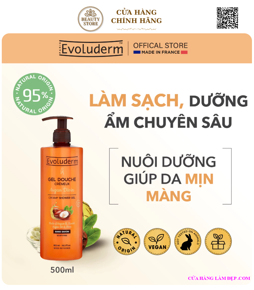 Tại hệ thống Cửa Hàng Làm Đẹp, sản phẩm Evoluderm Gel Tắm Argan and Karite 500ml từ Pháp có giá 225.000 VNĐ