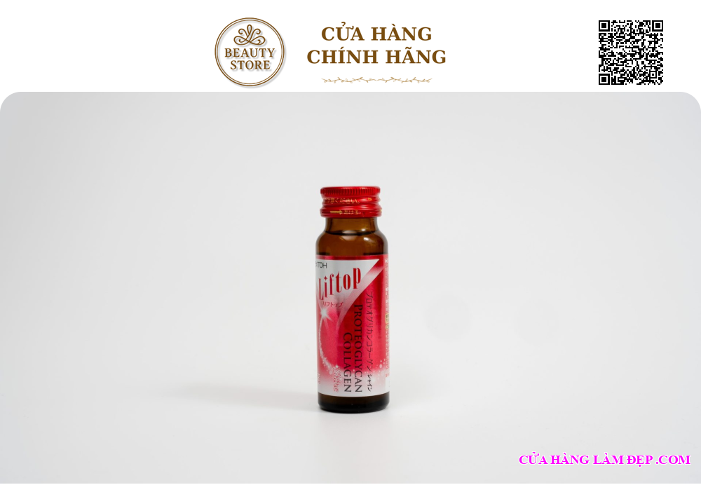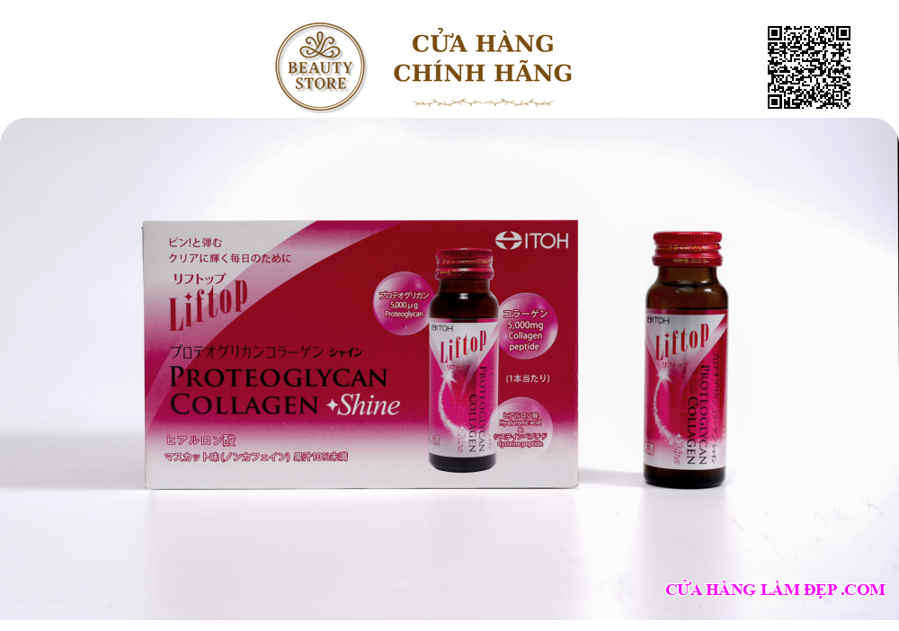 Liftop Proteoglycan Collagen Shine là sản phẩm chăm sóc da chuyên sâu đến từ thương hiệu Itoh Kanpo Nhật Bản, nổi bật với công thức phục hồi nền da từ bên trong. Mỗi chai chứa đến 5.000mg Collagen peptide cùng Hyaluronic Acid, Vitamin C và Cysteine peptide, giúp tăng sinh collagen nội sinh, cải thiện độ săn chắc và làm chậm quá trình lão hóa da.