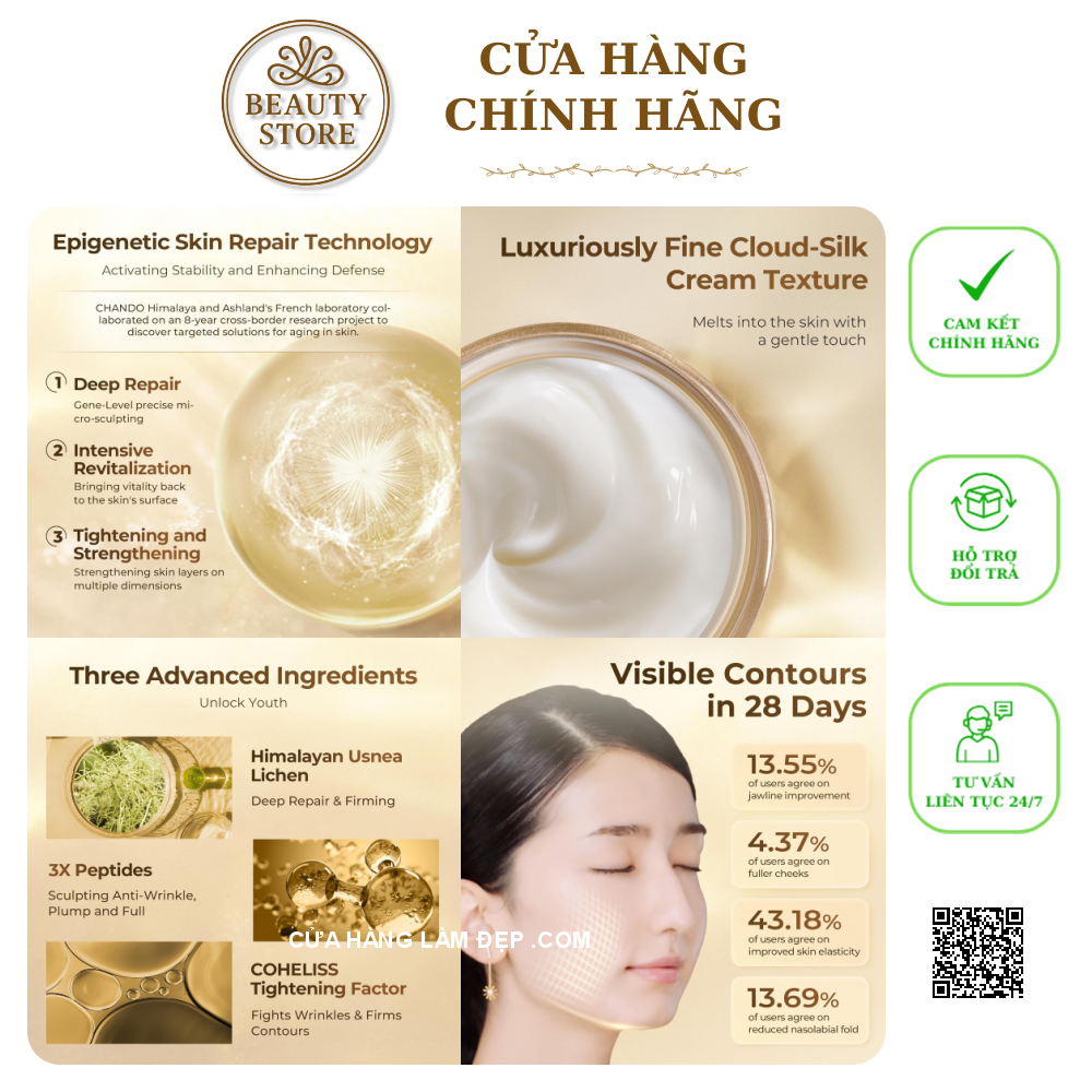Chăm sóc da tiên tiến với công nghệ tiên tiến: Được phát triển qua 8 năm hợp tác giữa CHANDO Himalaya và Ashland, công nghệ phục hồi da biểu sinh này cung cấp các giải pháp chống lão hóa có mục tiêu cho da. Làm mịn các khuyết điểm trên da, phục hồi bề mặt da và mang lại làn da săn chắc, mịn màng từ bên trong.