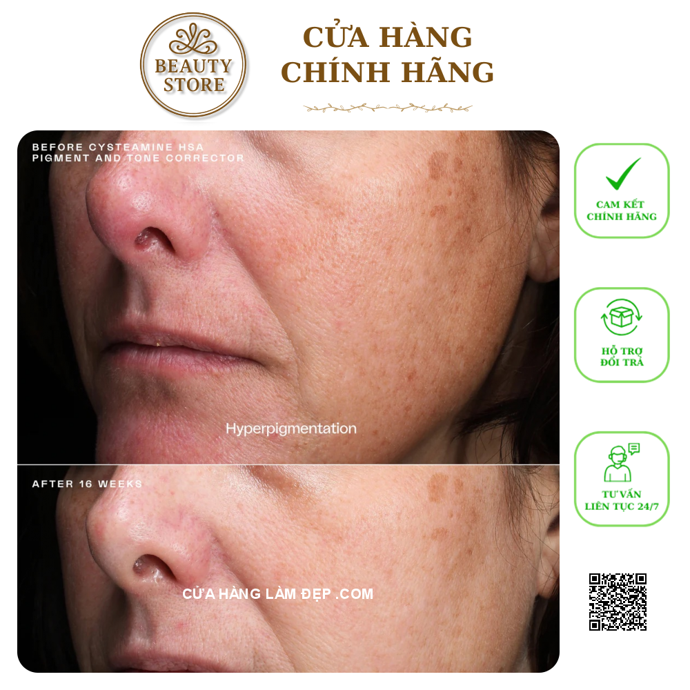 Loại kem cysteamine mang tính cách mạng này tập hợp hai hoạt chất mạnh mẽ, Heparan Sulfate Analog và Cysteamine HCl đã được cấp bằng sáng chế, để phục hồi làn da đều màu rõ rệt cho mọi tông màu da và cải thiện sự xuất hiện của các đốm đen. Kem chống nám, không chứa hydroquinone, an toàn khi sử dụng lâu dài và đủ dịu nhẹ cho làn da nhạy cảm.