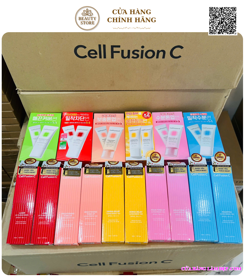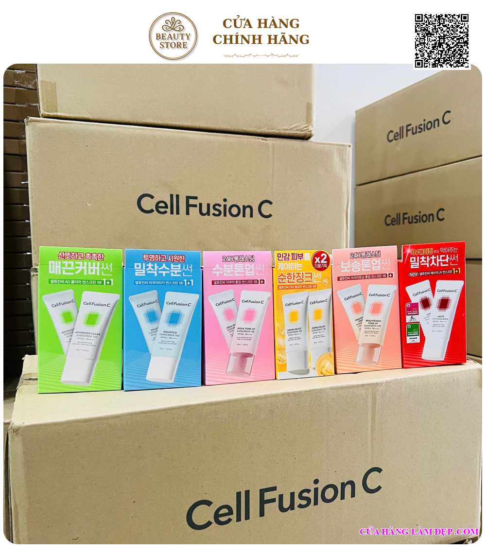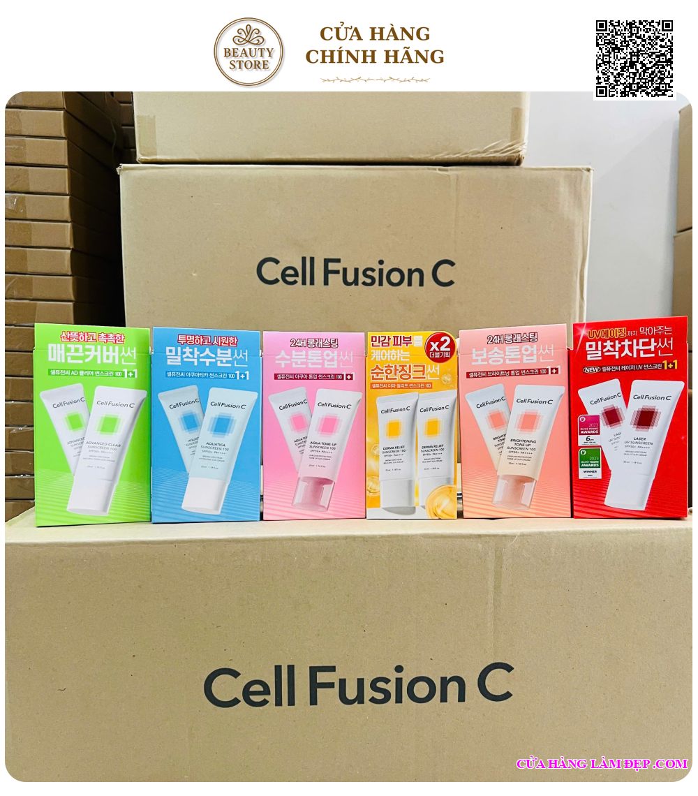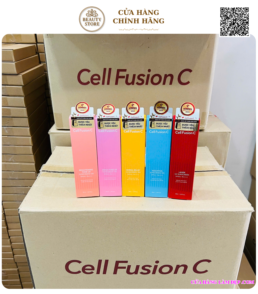 Tại hệ thống Cửa Hàng Làm Đẹp, sản phẩm Kem Chống Nắng Cell Fusion C Lazer/Advanced Clear/Brightening/Aqua Tone Up/Aquatica/Derma Relief Suncream 100 SPF 50+ 35ml Từ Hàn Quốc có giá 399.000 VNĐ/chai