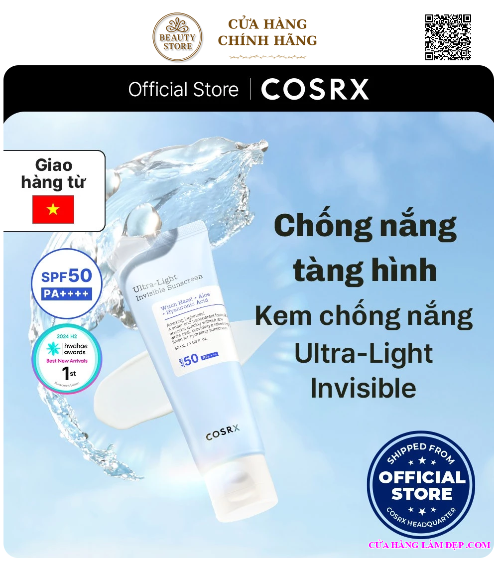 Tại hệ thống Cửa Hàng Làm Đẹp, sản phẩm Kem Chống Nắng COSRX Ultra Light Invisible Sunscreen SPF50 PA++++ Kem Chống Nắng Mỏng Nhẹ 50ml Từ Hàn Quốc có giá 552.000 VNĐ