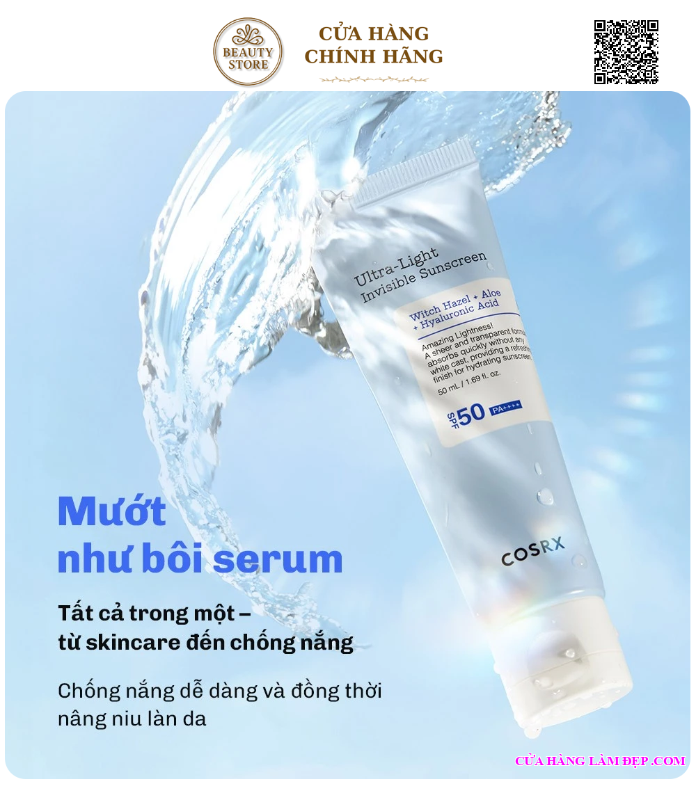 Kem Chống Nắng COSRX Ultra Light Invisible Sunscreen SPF50 PA++++ Kem Chống Nắng Mỏng Nhẹ 50ml Từ Hàn Quốc được khách hàng của Hệ Thống Cửa Hàng Làm Đẹp đánh giá cao.