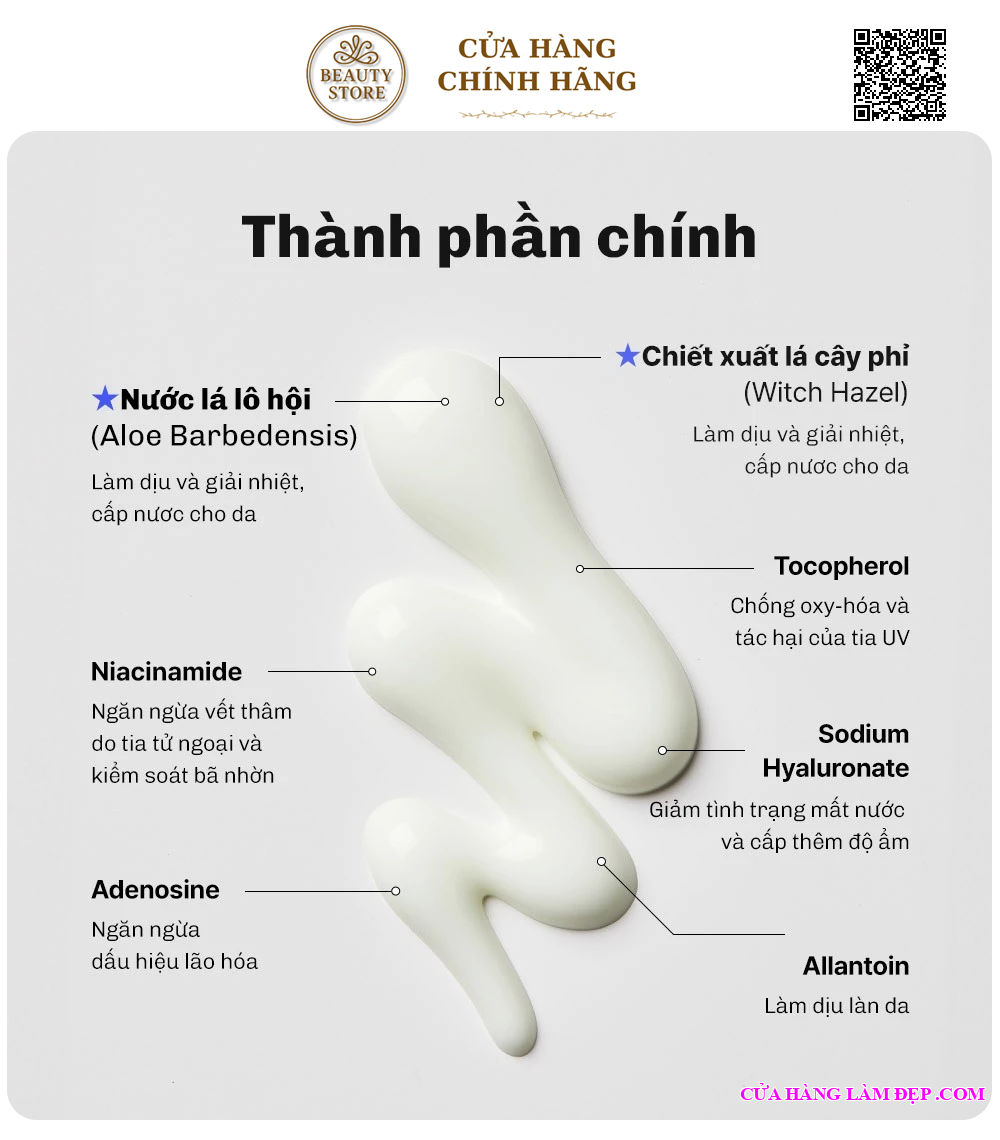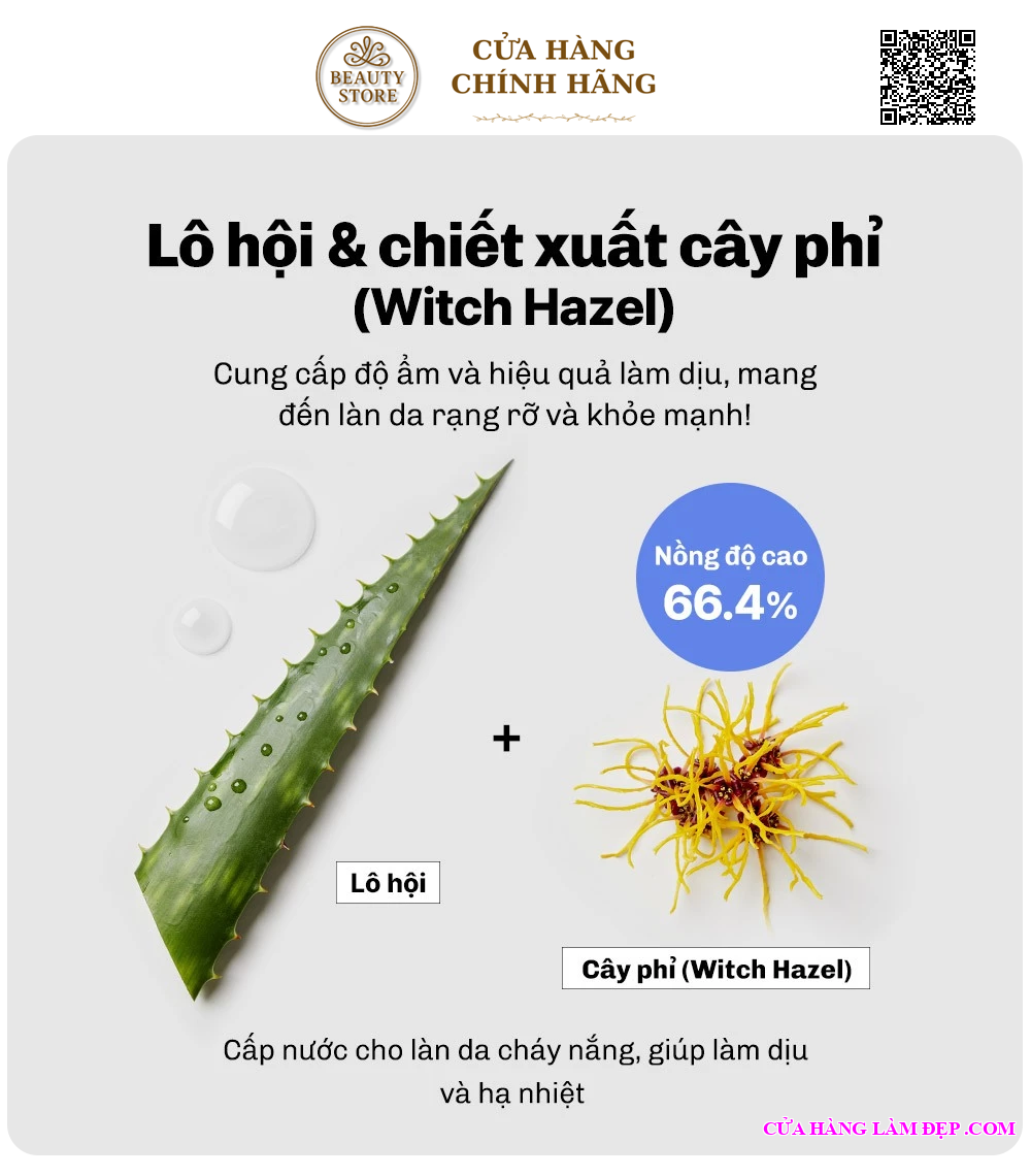 Chiết xuất lô hội (Aloe Vera) & Cây phỉ (Witch Hazel): Làm dịu da, giảm mẩn đỏ và phục hồi vùng da tổn thương.