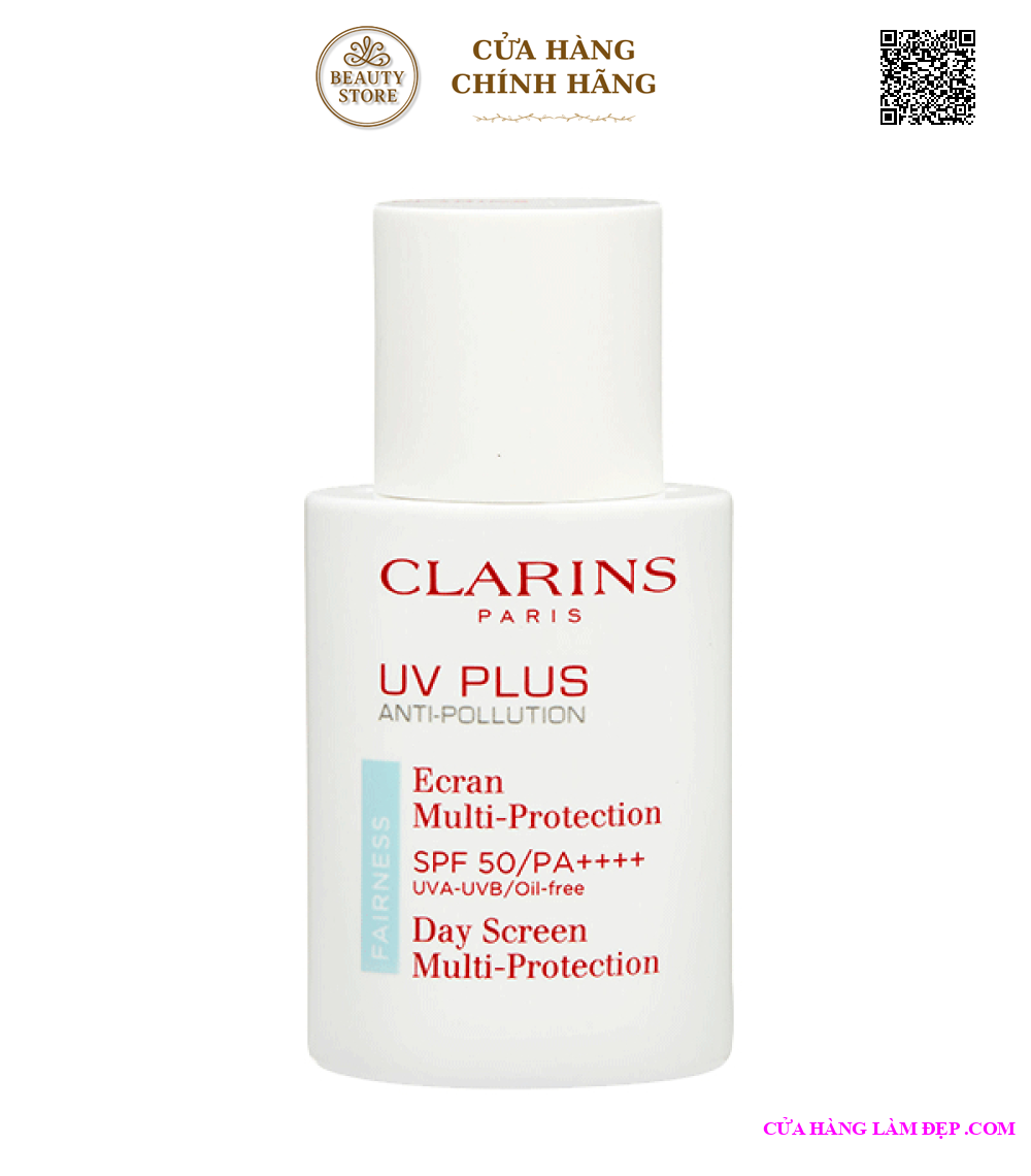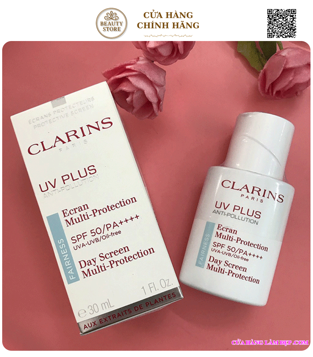 - Kem Chống Nắng Fairness Clarins UV Plus Anti-Pollution SPF50/PA++++ hạn chế được cả tia UVA và UVB ở quang phổ cao, bảo vệ da khỏi gốc tự do và ô nhiễm môi trường, làm da trắng sáng. Làn da được bảo vệ da trong nhiều giờ liền. Chất kem mỏng nhẹ của sản phẩm có khả năng thẩm thấu nhanh chóng vào da và phát huy khả năng kiềm dầu.