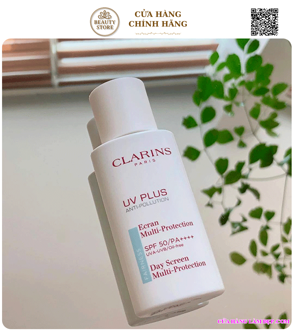 - Kem Chống Nắng Fairness Clarins UV Plus Anti-Pollution SPF50/PA++++ hạn chế được cả tia UVA và UVB ở quang phổ cao, bảo vệ da khỏi gốc tự do và ô nhiễm môi trường, làm da trắng sáng. Làn da được bảo vệ da trong nhiều giờ liền. Chất kem mỏng nhẹ của sản phẩm có khả năng thẩm thấu nhanh chóng vào da và phát huy khả năng kiềm dầu.
