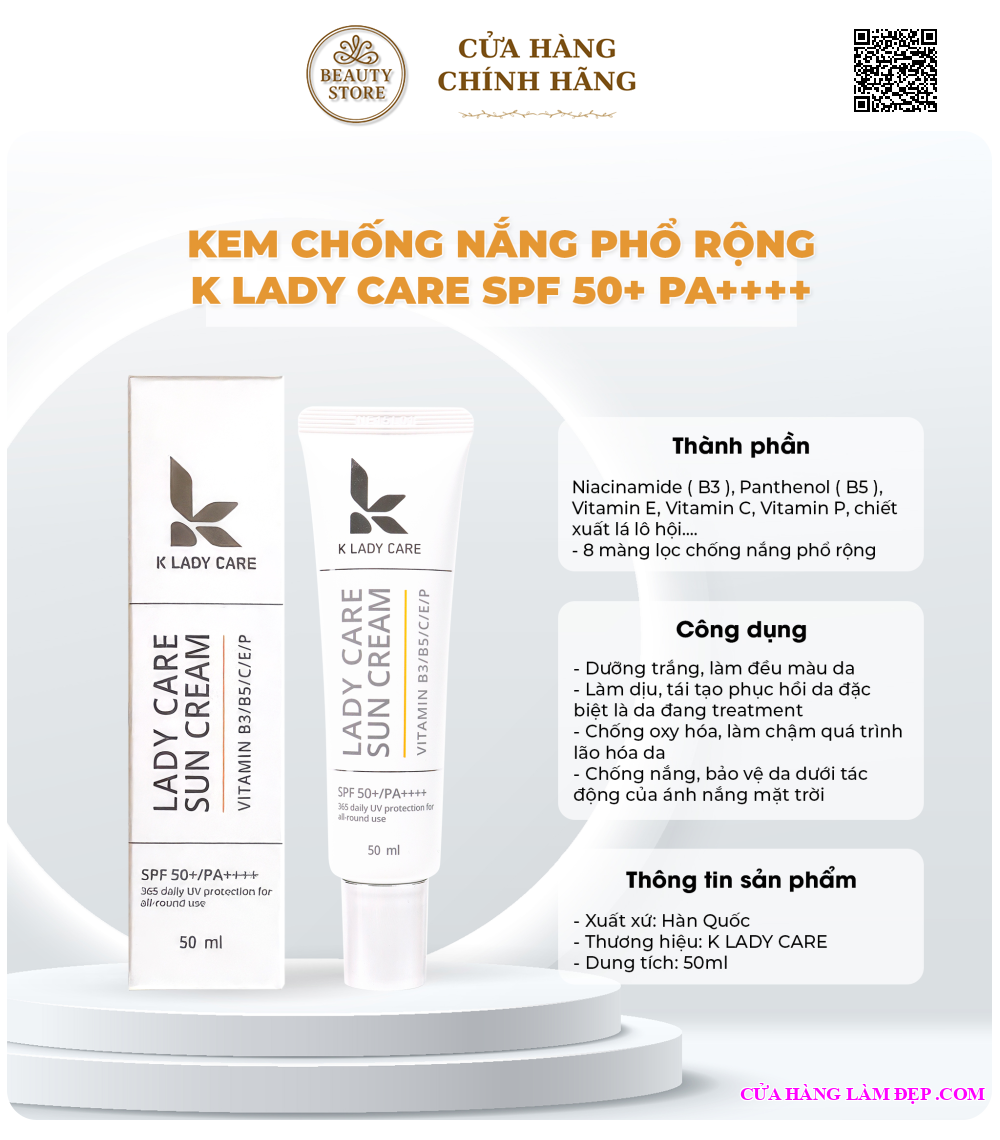 - Kem chống nắng phổ rộng K Lady care Sun Cream SPF 50+ PA++++ là sản phẩm hoàn hảo mà chị em nên sử dụng. Dù là mùa đông hay mùa hè,kem chống nắng K lady care vừa tạo lớp bảo vệ tối ưu, lại có công dụng nuôi dưỡng và phục hồi làn da trắng hồng rạng ngời. Hãy sở hữu ngay kem chống nắng phổ rộng K Lady care Sun Cream SPF 50+ PA++++ để có làn da khỏe đẹp và tự tin nhé!