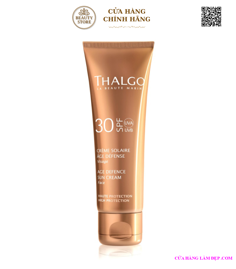 - Kem chống nắng chống sạm da Thalgo Age Defense Sun Cream SPF 30 sở hữu công thức tiên tiến nổi bật với hoạt chất độc quyền từ tảo biển, sản phẩm chống nắng AGE DEFENCE của Thalgo giúp bạn tự tin thách thức tuổi tác với tác dụng 3 trong 1: Chống tia UVA và UVB, chống sạm da và chống lão hóa.