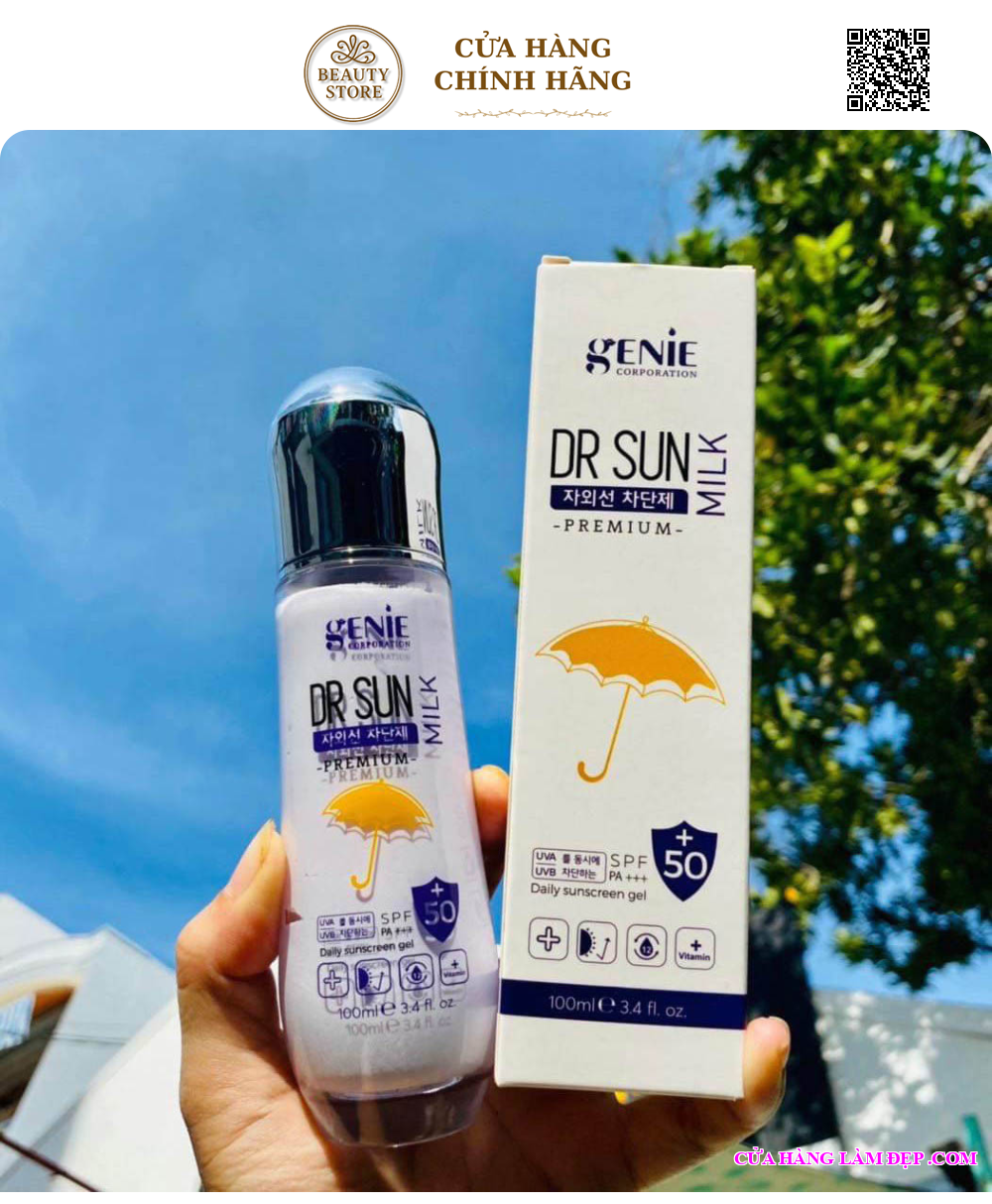 Kem Chống Nắng Vật Lý Genie Dr Sun Milk Premium SPF50 PA+++ là phiên bản mới nhất so với kem chống nắng Hello Sunny được bổ sung thêm tính năng chống tía UV cao hơn, nhiều hoạt chất dưỡng da và đổi hoàn toàn ngoại hình. Dr Sun Milk nổi bật ở dạng gel sữa thấm nhanh hơn, giữ nước khá ổn. Thích hợp với mọi loại da. Từ da dầu đến da khô. Ngay cả những quý cô có làn da nhạy cảm nhất cũng có thể sử dụng sản phẩm. Không gây dị ứng, không tác dụng phụ hay mẩn đỏ trên da.