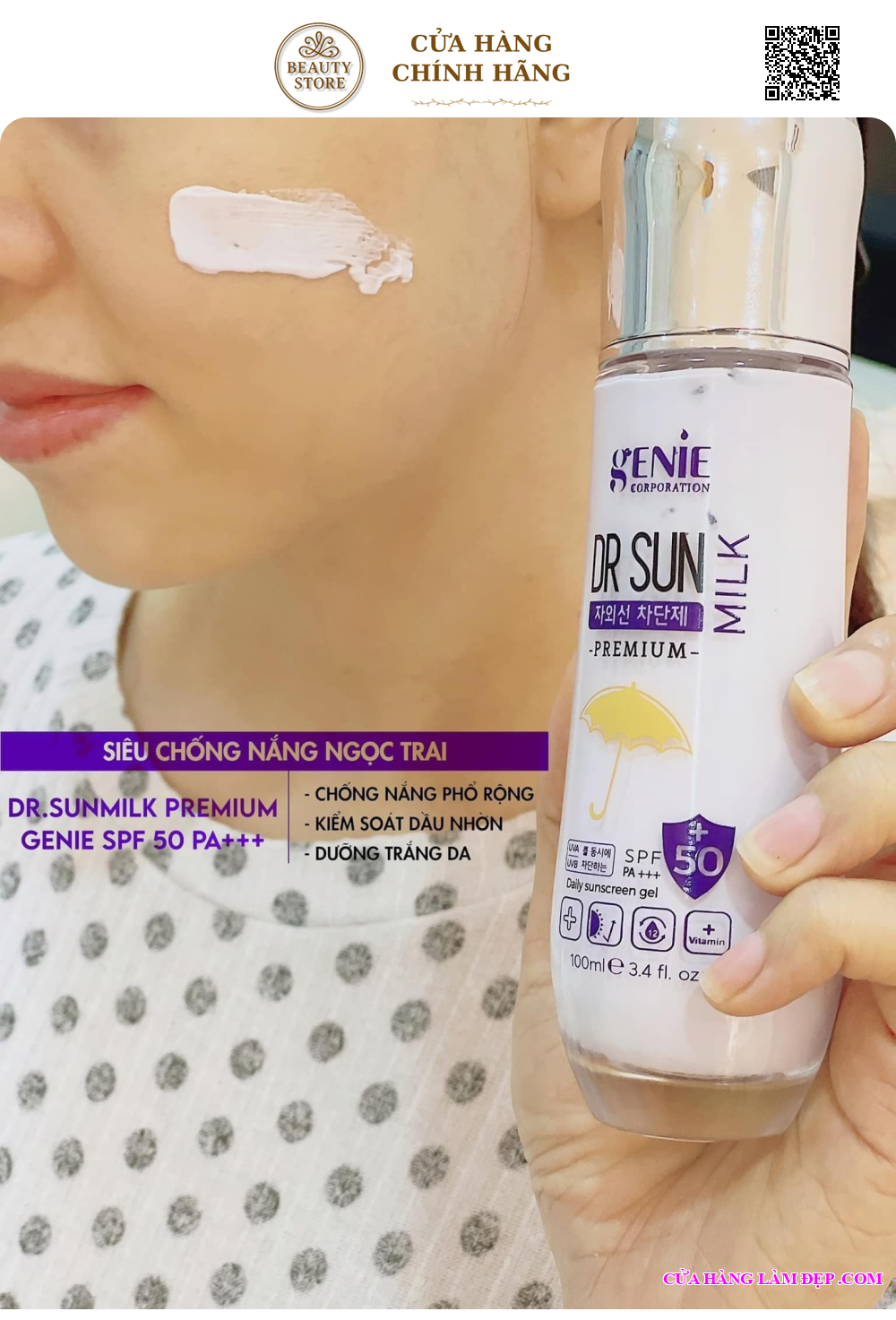 Tại hệ thống cửa hàng làm đẹp, Kem Chống Nắng Vật Lý Genie Dr Sun Milk Premium SPF50 PA+++ có giá: 690.000 VND