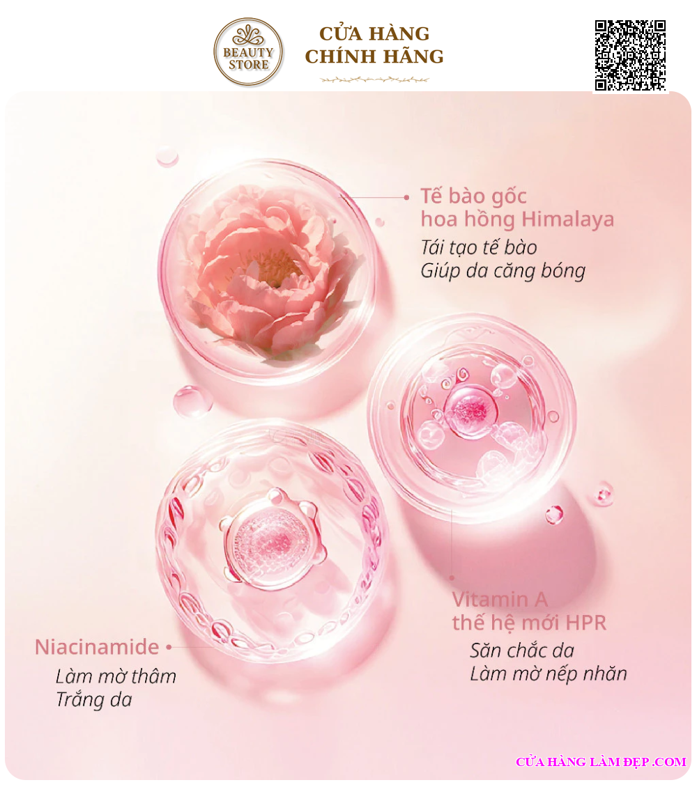 Với công thức chứa Tinh Chất Tế Bào hoa hồng kết hợp cùng các hoạt chất chống oxy hóa, sản phẩm giúp tái tạo làn da, tăng độ đàn hồi và mang lại vẻ ngoài tươi trẻ, rạng rỡ. Kết cấu kem mềm mịn, thẩm thấu nhanh, không gây nhờn rít, phù hợp với nhiều loại da.
