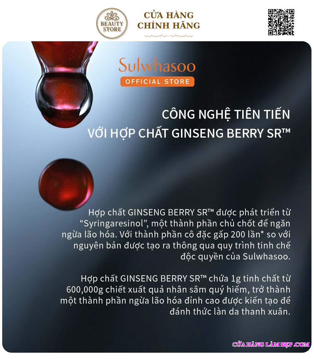 - Hợp chất Ginseng Berry Sr™ được phát triển từ “Syringaresinol”, một thành phần chủ chốt hỗ trợ ngăn ngừa lão hóa. Với thành phần cô đặc gấp 200 lần* so với nguyên bản được tạo ra thông qua quy trình tinh chế độc quyền của Sulwhasoo.