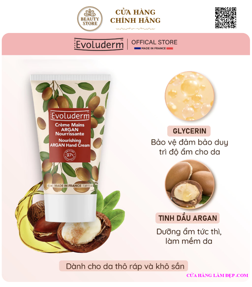 Kem dưỡng da tay Evoluderm Argan là sản phẩm chăm sóc da tay đến từ thương hiệu mỹ phẩm Pháp Evoluderm, nổi tiếng với các dòng sản phẩm thuần chay, lành tính và hiệu quả. Với chiết xuất từ tinh dầu Argan nguyên chất – được mệnh danh là “vàng lỏng” của vùng Ma-rốc – sản phẩm giúp nuôi dưỡng, làm mềm và bảo vệ da tay khỏi tình trạng khô ráp, nứt nẻ.