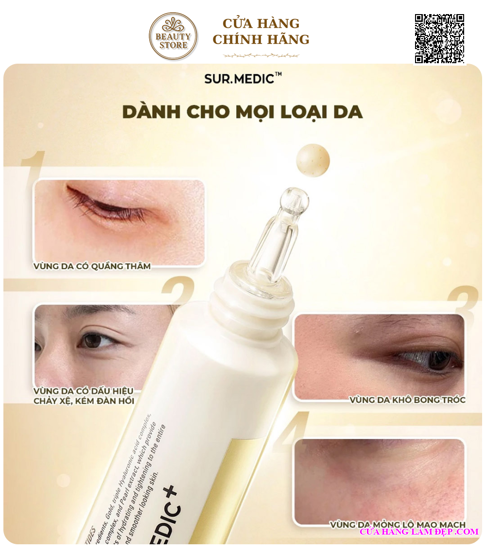 Kem Dưỡng Mắt Sur.Medic+ Giảm Nếp Nhăn, Ngăn Lão Hóa là sản phẩm chăm sóc vùng da mắt chuyên sâu đến từ thương hiệu mỹ phẩm Hàn Quốc Sur.Medic+, nổi bật với công nghệ Perfection 100™ và bảng thành phần cao cấp. Sản phẩm được thiết kế để cải thiện toàn diện các vấn đề vùng mắt như nếp nhăn, quầng thâm, bọng mắt và thiếu độ đàn hồi.