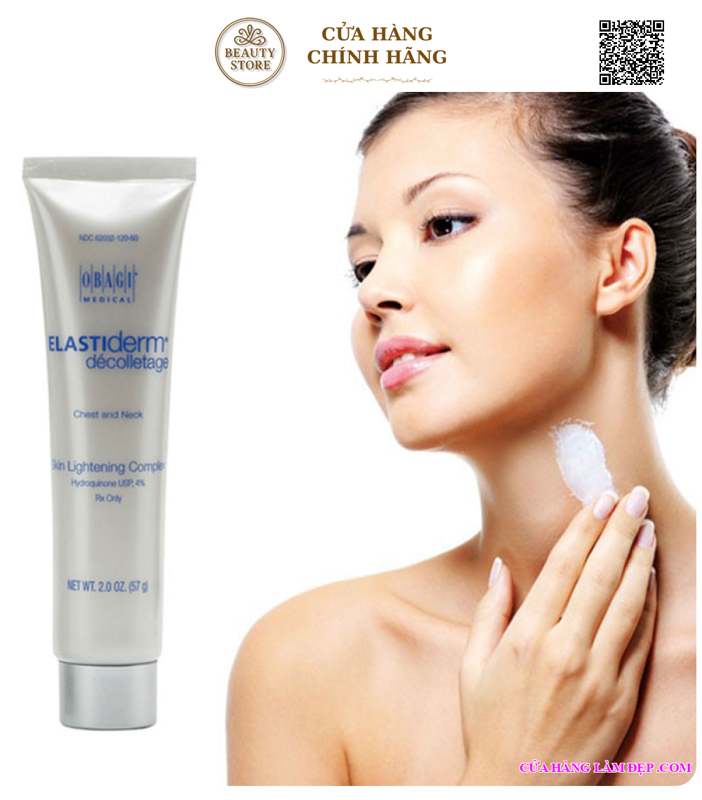 Vùng da cổ và ngực cũng thường xuyên tiếp xúc trực tiếp với ánh nắng, cũng chịu nhiều tổn thương và trở nên kém sắc do đây thường là vùng da các chị em quên đi cách bảo vệ. Kem dưỡng trắng da vùng cổ và ngực Obagi Elastiderm Decolletage Skin Lightening Complex chứa 4‰ hydroquinone giúp giảm những biểu hiện lão hóa: nám, sạm, kết hợp với vitamin C chống oxy hóa vượt trội, góp phần tái tạo tế bào mới, phục hồi da tổn thương do tia UV từ ánh nắng mặt trời, nuôi dưỡng vùng da cổ và ngực trắng sáng, mịn màng. Kem dưỡng trắng da vùng cổ và ngực Obagi Elastiderm Decolletage Skin Lightening Complex còn chứa thành phần glycerin tăng cường ẩm, giảm kích ứng da khiến da khỏe mạnh và dễ dàng sử dụng cho mọi làn da.