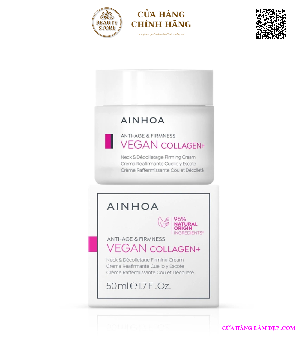 Kem Làm Giảm Nếp Nhắn, Nâng Cơ Sơn Chắc Vùng Ngực, Cổ AINHOA Vegan Collagen+ Neck & Decolletage Firming Cream là kem dưỡng chuyên dụng dành cho vùng cổ và ngực, có thành phần chính là collagen thực vật (vegan collagen). Sản phẩm này được thiết kế nhằm giảm thiểu nếp nhăn, nâng cơ và làm săn chắc vùng da nhạy cảm này. Sản phẩm này thường được khuyên sử dụng đều đặn để có kết quả tốt nhất, giúp làm giảm sự xuất hiện của nếp nhăn và làm cho vùng cổ và ngực trở nên săn chắc, trẻ trung hơn.