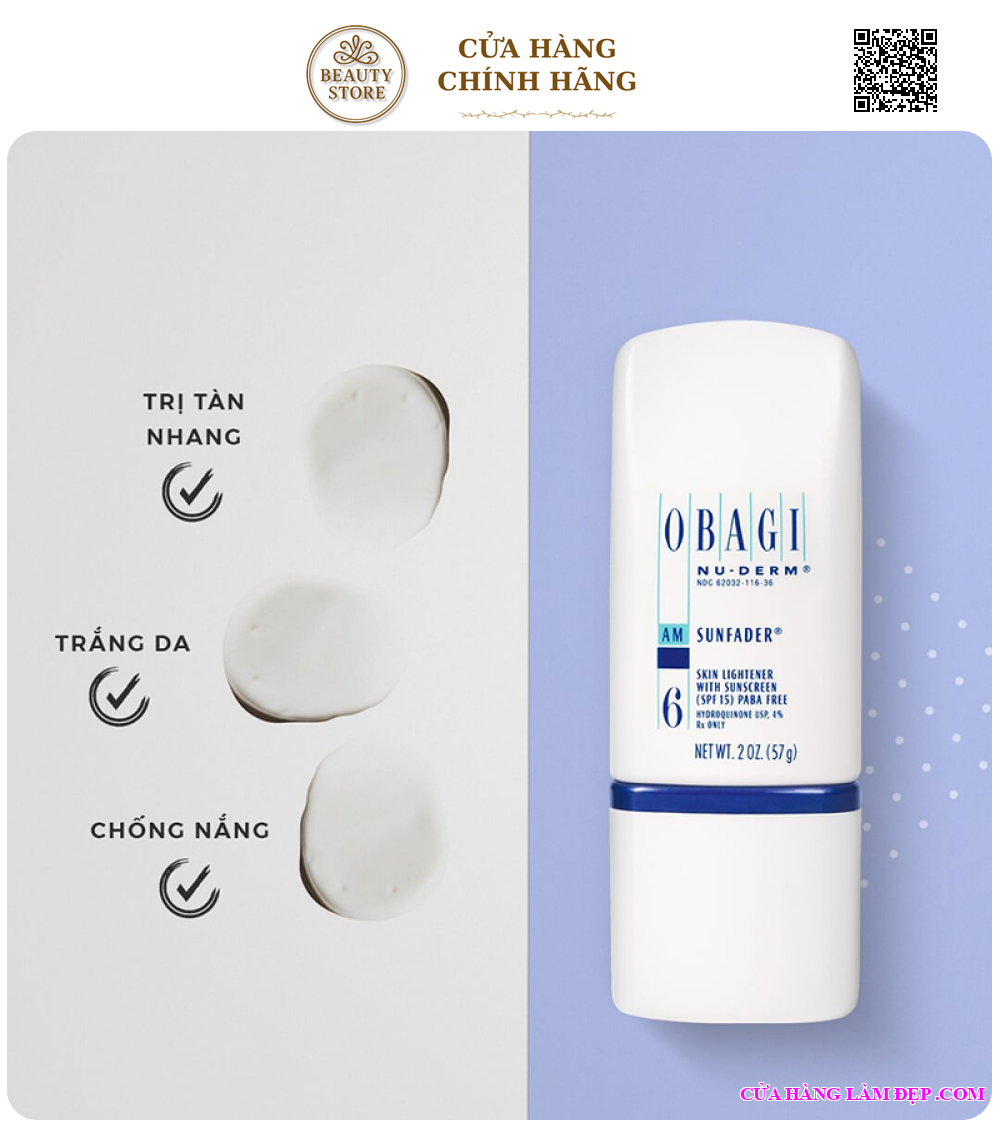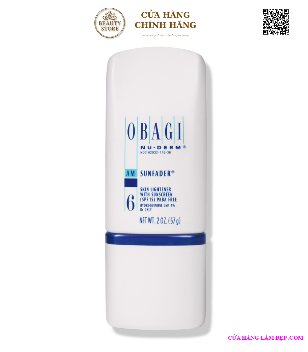 - Obagi Nu-Derm Sunfader chứa 4% hydroquinone và SPF 15 là giải pháp lý tưởng cho làn da cần đặc trị đốm nâu, tàn nhang, tăng sắc tố. Sự kết hợp kép giữa thành phần trị nám và chống nắng cho kết quả tốt nhất, cho da mịn màng, rạng rỡ, đồng màu và săn chắc.