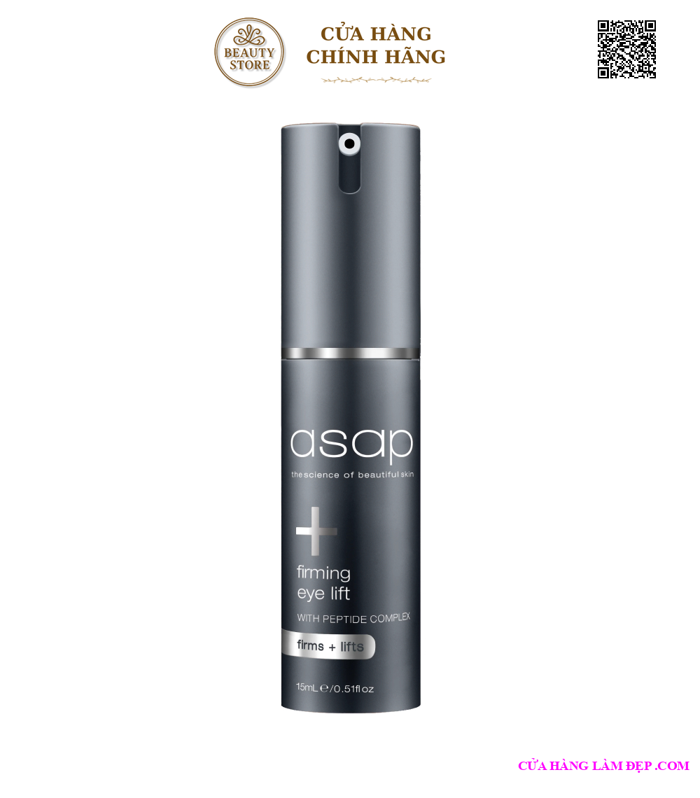 Asap Firming Eye Lift là siêu phẩm kết hợp hoàn hảo đa công dụng, vừa điều trị nếp nhăn, vừa giảm thâm quầng và bọng mắt hiệu quả. Công thức chứa sự kết hợp đa peptide giúp săn chắc vùng da mắt, tăng cường sản xuất elastin và collagen đồng thời bảo vệ khỏi sự suy thoái collagen. Sản phẩm đầu tiên của Úc có thành phần cải tiến giúp cải thiện mật độ da, chống lại sự mất mát collagen do căng thẳng và bảo vệ da khỏi ô nhiễm. Công thức chống lão hóa nhắm vào quầng thâm, bọng mắt và nếp nhăn. Sử dụng thường xuyên sẽ mang lại làn da mịn màng, tươi sáng và ngậm nước hơn.