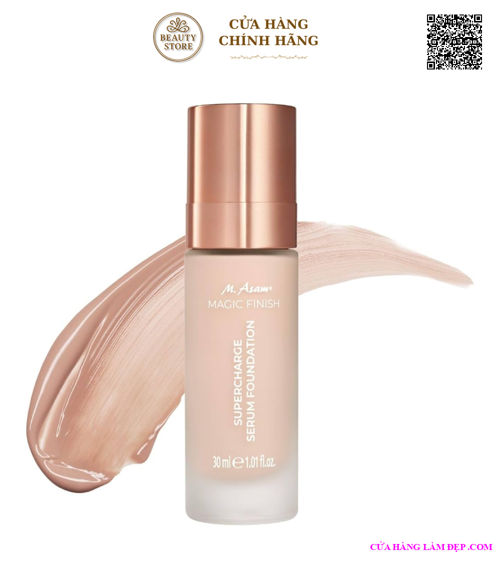 - M. Asam Magic Finish Supercharge Serum Foundation 180 Rose Fair vừa cung cấp độ ẩm chuyên sâu cho da, giúp da luôn mềm mại và săn chắc mà vừa mang lại cho các nàng lớp trang điểm hoàn hảo với khả năng bám bền, ngăn ngừa tình trạng chảy nền, khô mốc và kém tự nhiên.