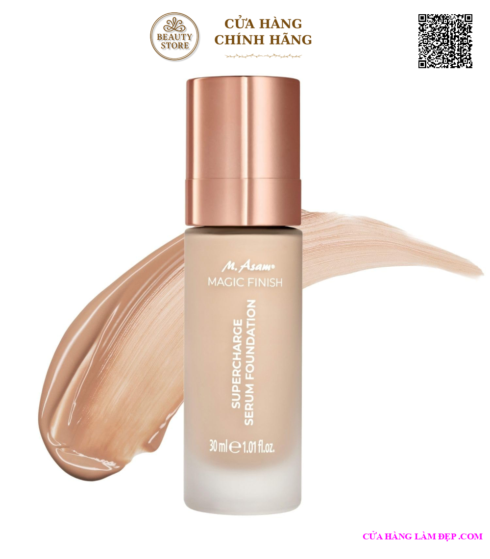 - M. Asam Magic Finish Supercharge Serum Foundation 200 Warm Sand vừa cung cấp độ ẩm chuyên sâu cho da, giúp da luôn mềm mại và săn chắc mà vừa mang lại cho các nàng lớp trang điểm hoàn hảo với khả năng bám bền, ngăn ngừa tình trạng chảy nền, khô mốc và kém tự nhiên.