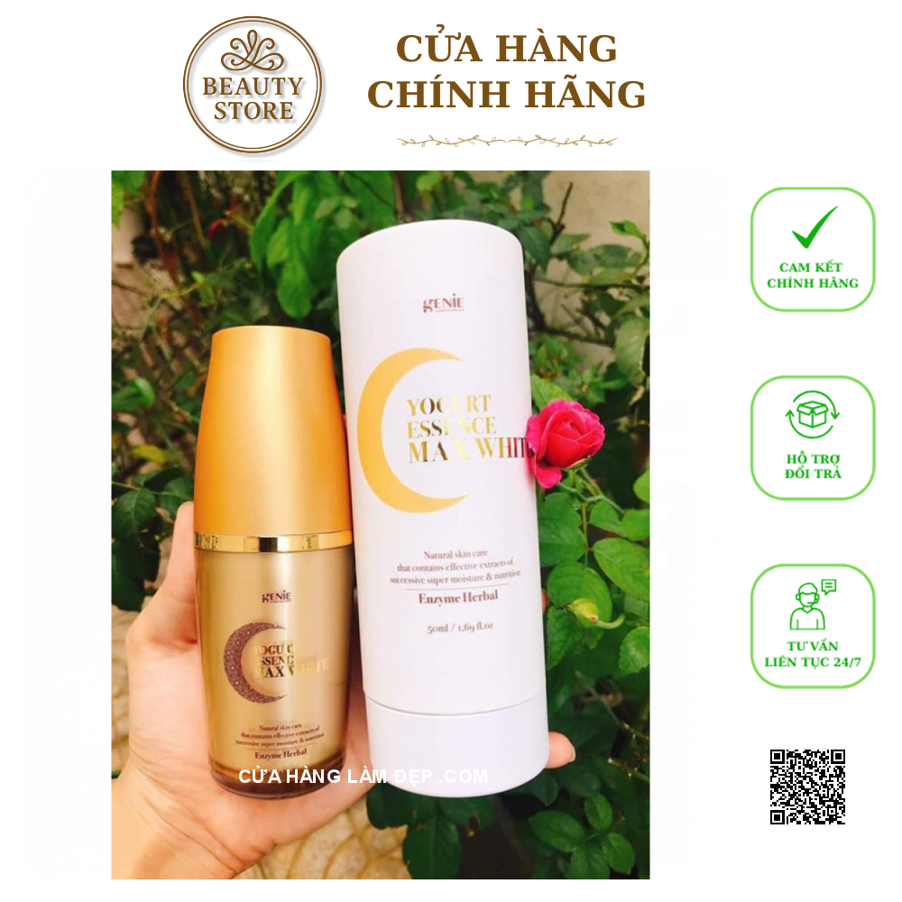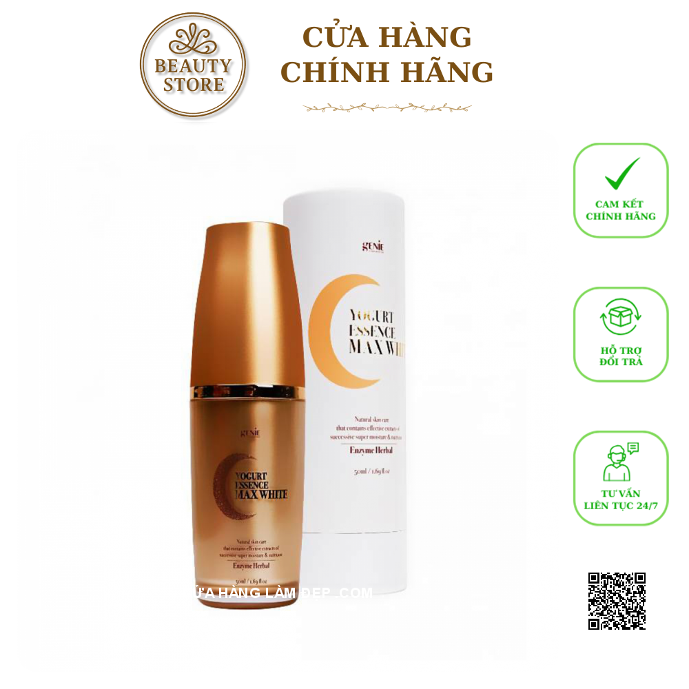 - Kem sữa chua lên men Genie Yogurt Essence Max White dưỡng trắng da, làm giảm thâm sạm, nám, tăng sinh collagen duy trì làn da đàn hồi, săn chắc, kích thích tái tạo và cung cấp dưỡng chất cho làn da khỏe mạnh, tươi sáng. Kem sữa chua Genie an toàn cho làn da nhạy cảm, không gây kích ứng.