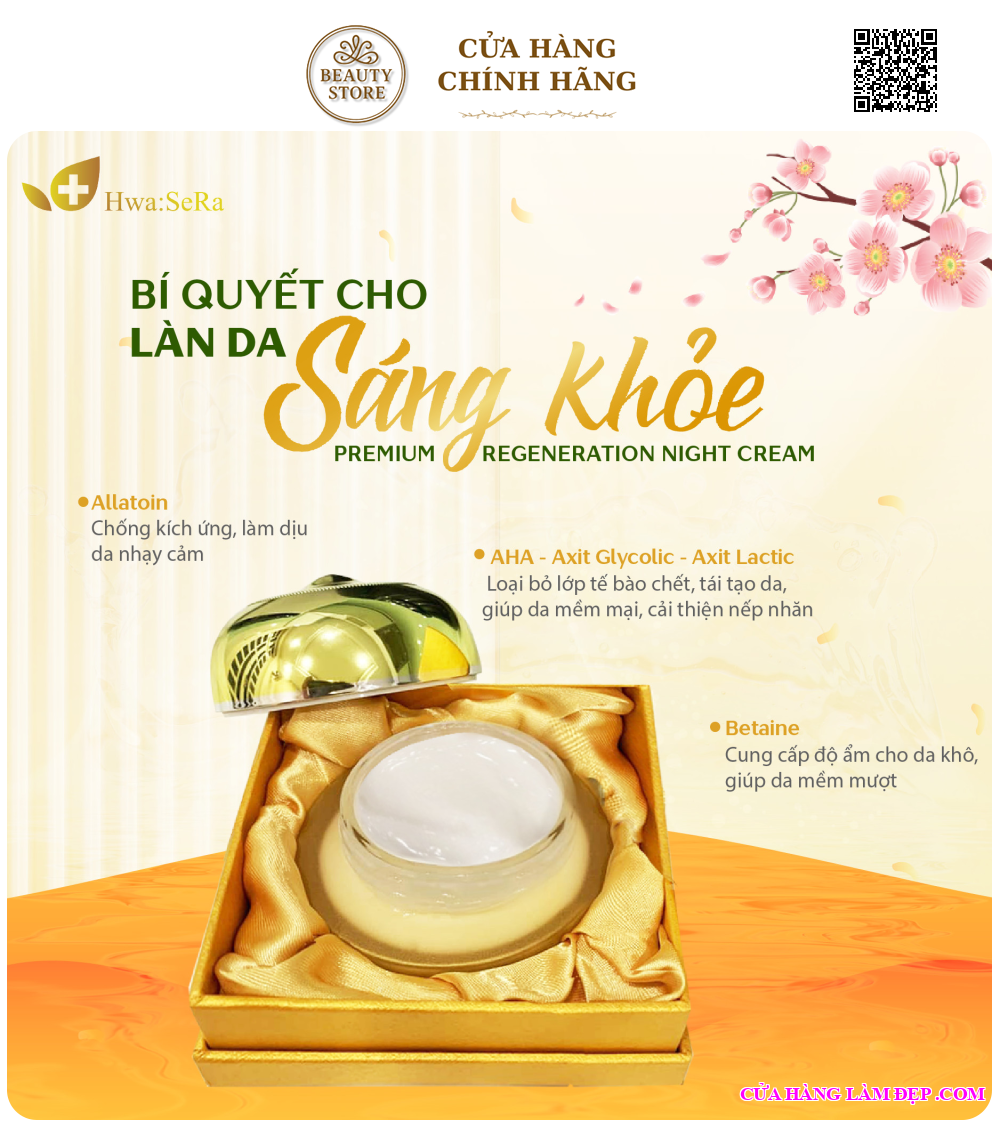 - Hwa:SeRa Premium Regeneration Night Cream kem tái sinh da ban đêm sẽ bổ sung những thành phần chiết xuất tự nhiên như AHA – Axit Glycolic – Axit Lactic,… giúp tái sinh từng tế bào, phục hồi da hiệu quả, dưỡng da trắng hồng tự nhiên.