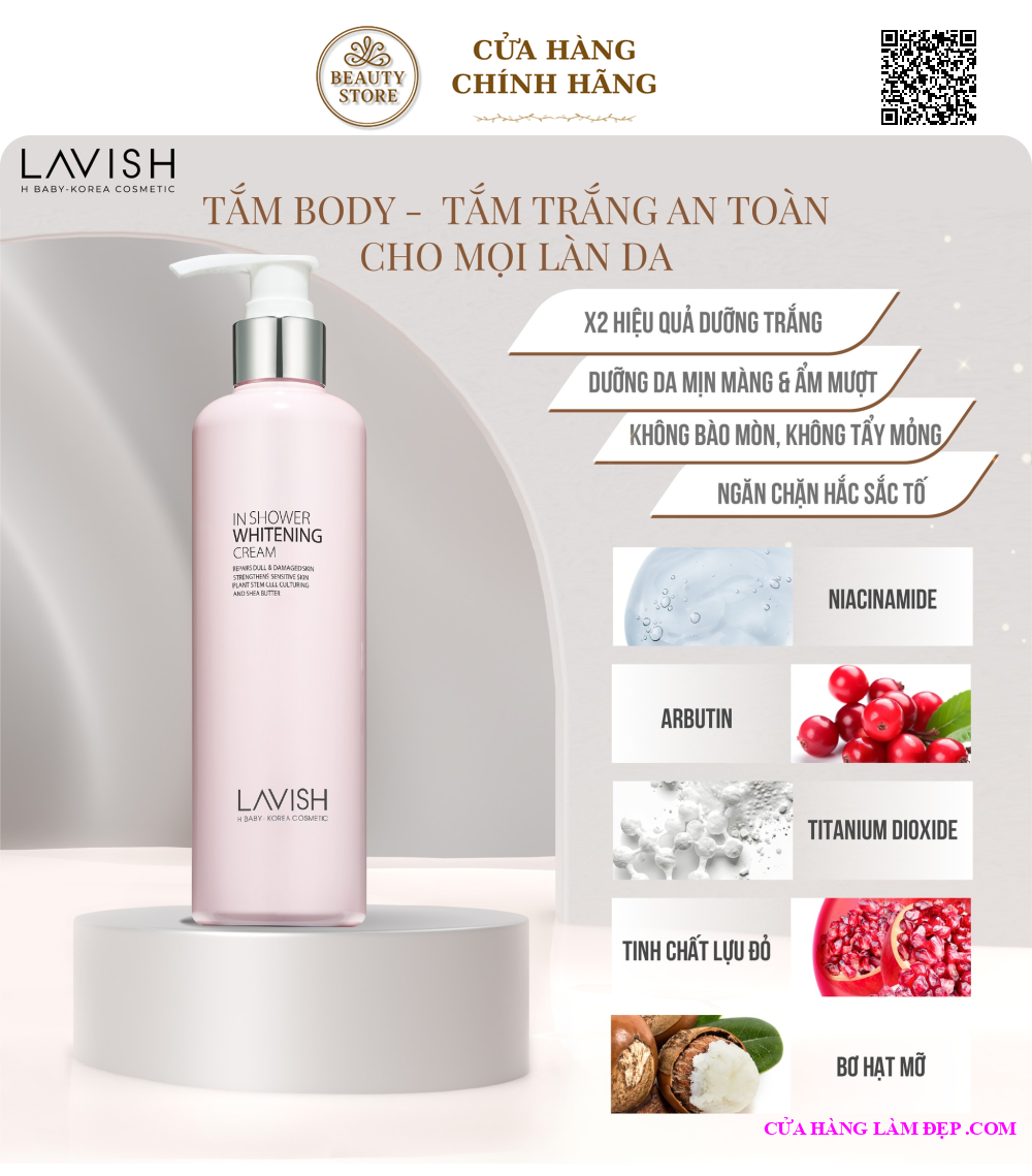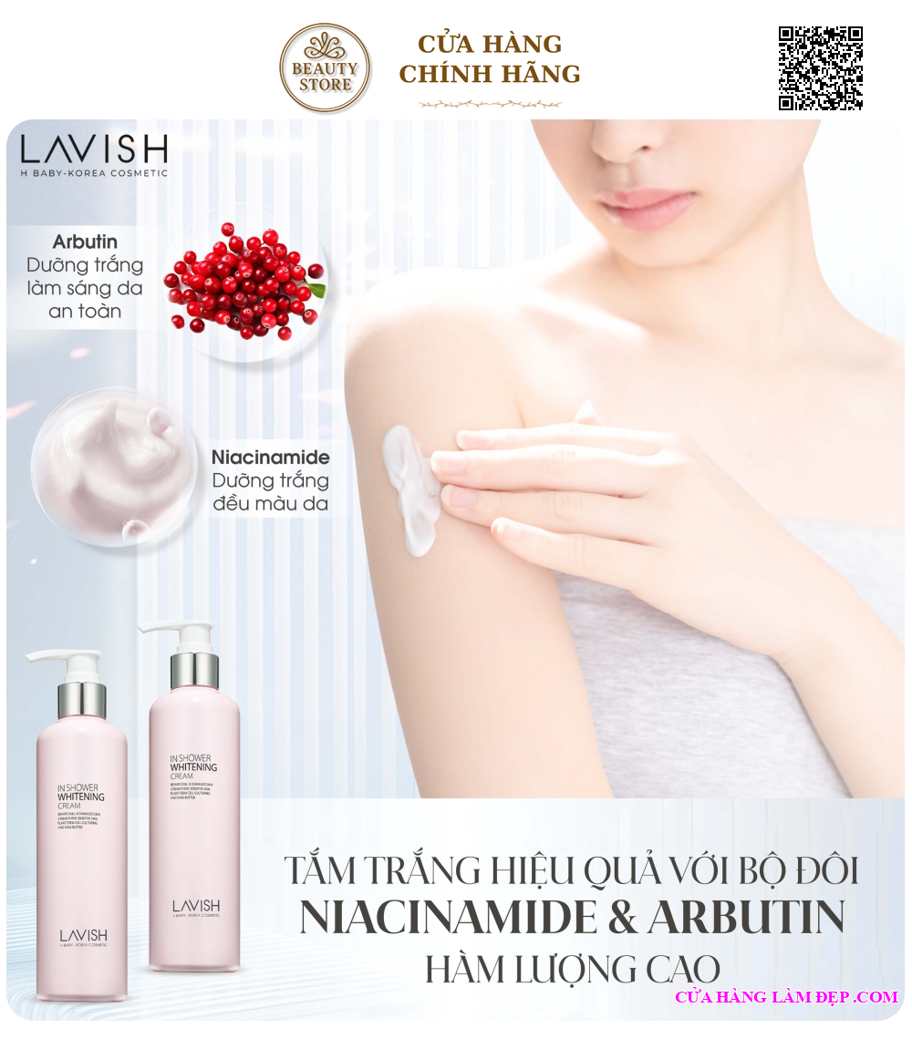Kem Tắm Trắng Chuyên Sâu Dành Cho Body In Shower Whitening Cream Lavish H Baby với thành phần được chiết xuất từ thiên nhiên cùng hoạt chất vi lượng siêu trắng Arbutin, Niacinamide giúp cải thiện ngay làn da đen sạm, tối màu chỉ sau 20 phút: