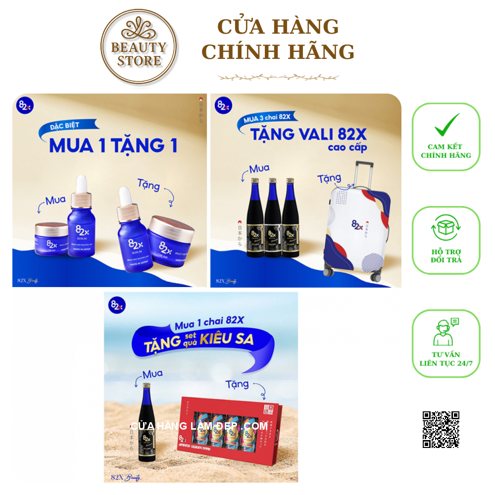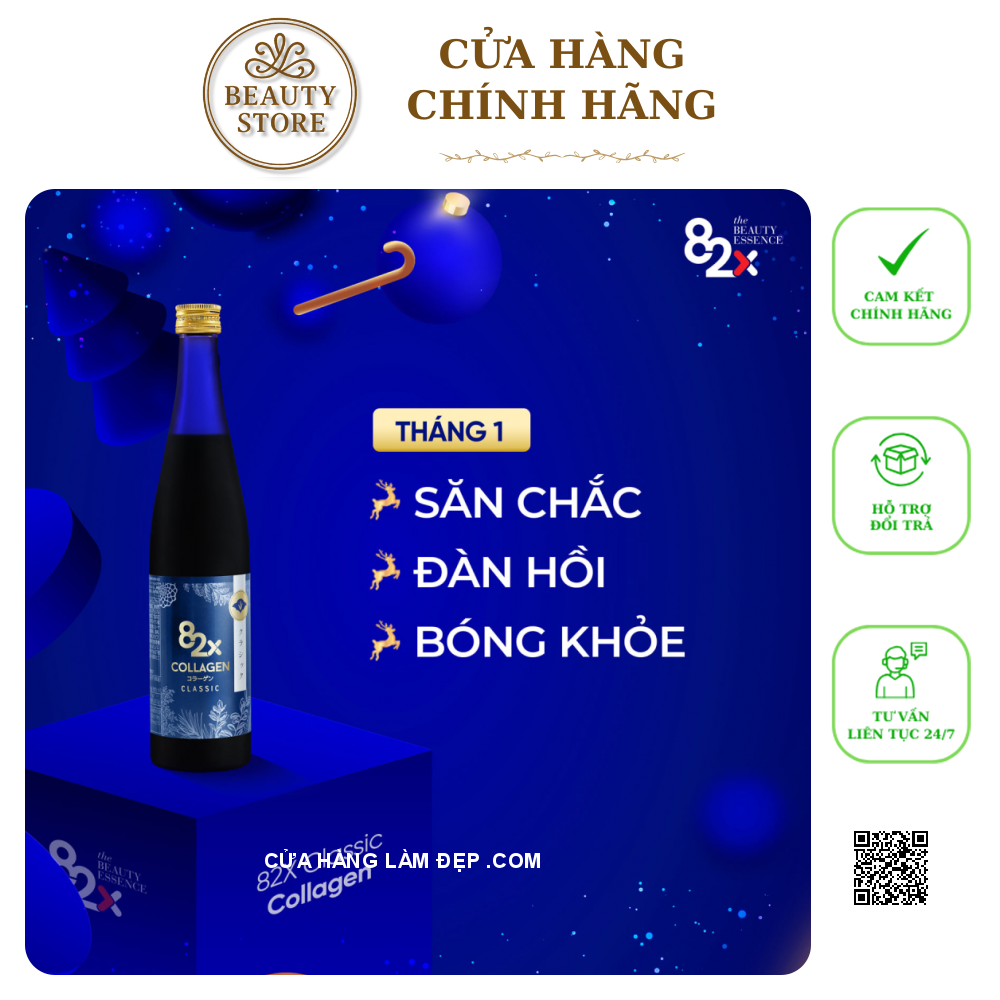 - Khả năng TRẺ HÓA DA TỰ NHIÊN: Với 120.000mg Collagen peptide cao nhất thị trường hiện nay; cùng 1.000mg chiết xuất hoa Anh đào và các dưỡng chất cao cấp Elastin, tơ thủy phân, sữa ong chúa,... 82X Collagen tăng cường chống lão hóa, làm giảm nếp nhăn, chùng nhão, mang đến làn da mềm mại, bóng khỏe.