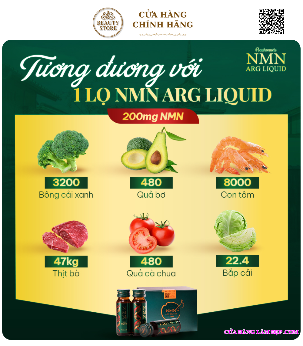 - Nước Uống Đẹp Da Peauhonnete NMN+ Arg Liquid 12000 với thành phần NMN được bảo vệ ở dạng nano ổn định, không phân hủy. Công thức hỗ trợ của ba loại men vi sinh đồng lên men giúp hấp thu sản phẩm tốt hơn, đảm bảo hàm lượng NMN đưa vào cơ thể đủ đáp ứng nhu cầu NMN cần thiết trong một ngày.