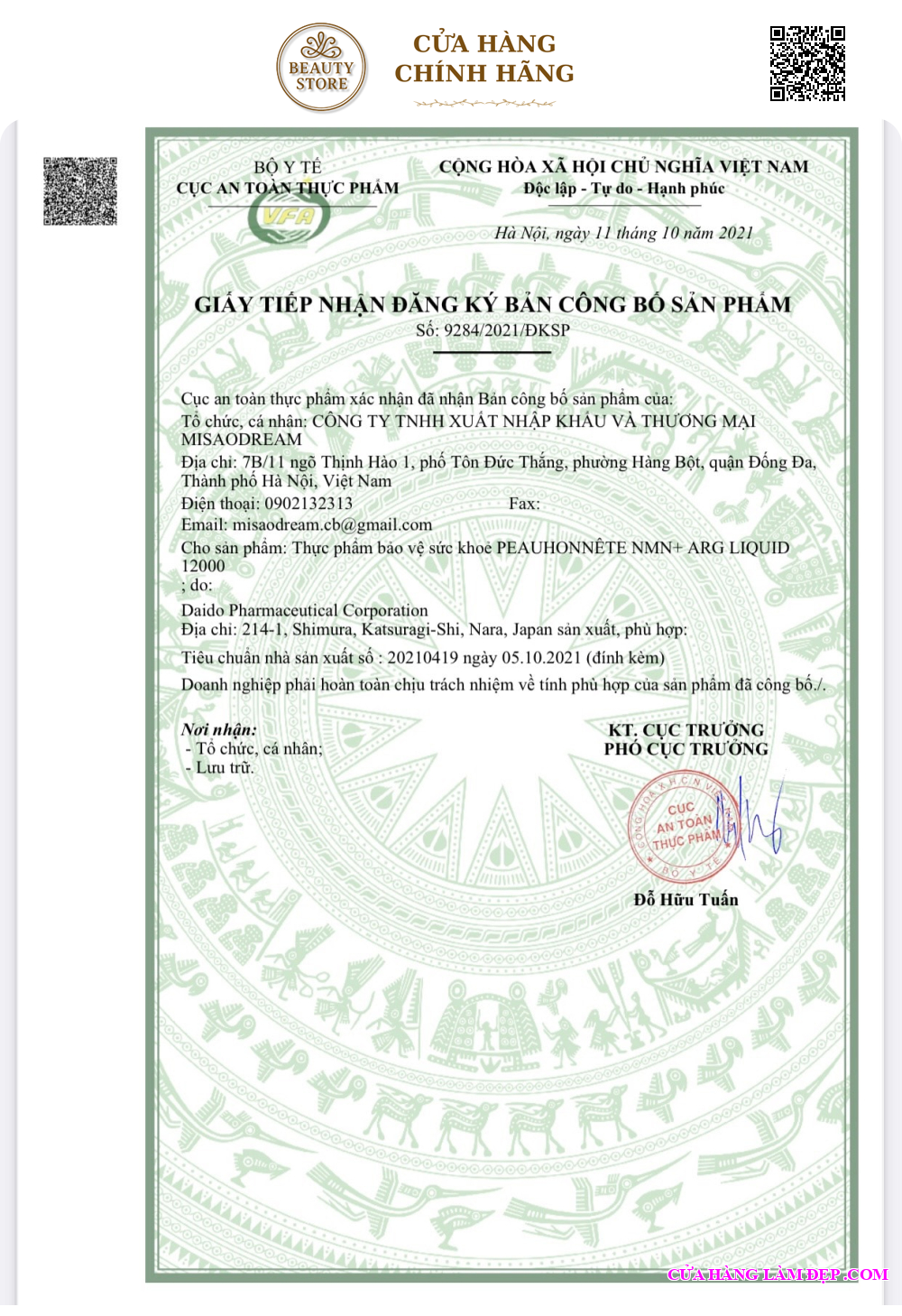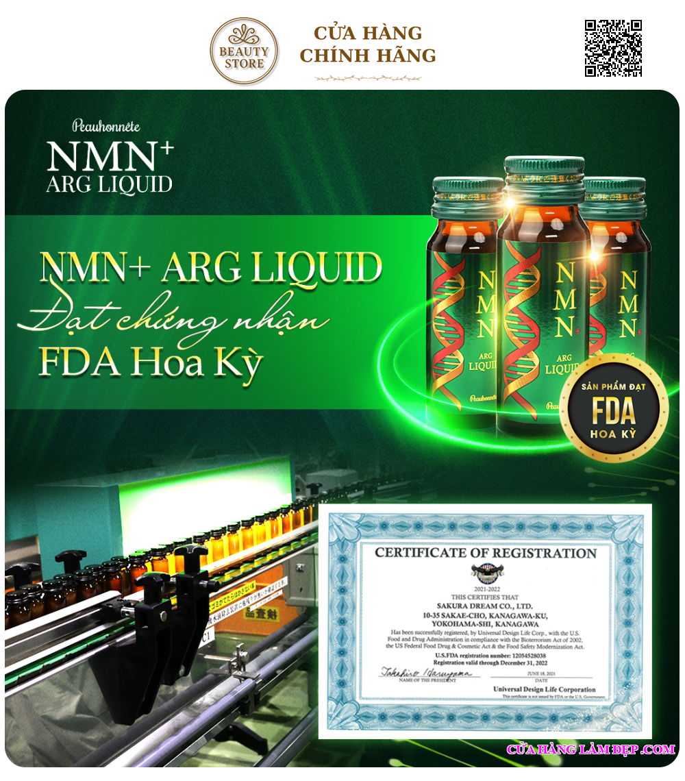- Nước Uống Đẹp Da Peauhonnete NMN+ Arg Liquid 12000 được sản xuất tại Công ty Daido Pharmaceutical Corporation có tuổi đời 75 năm, đồng thời là nhà sản xuất đồ uống, thực phẩm nổi tiếng tại xứ hoa anh đào. Sản phẩm này chứa thành phần NMN giúp "trẻ hóa cơ thể từ bên trong”.